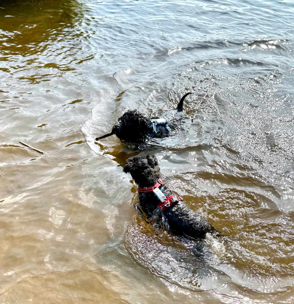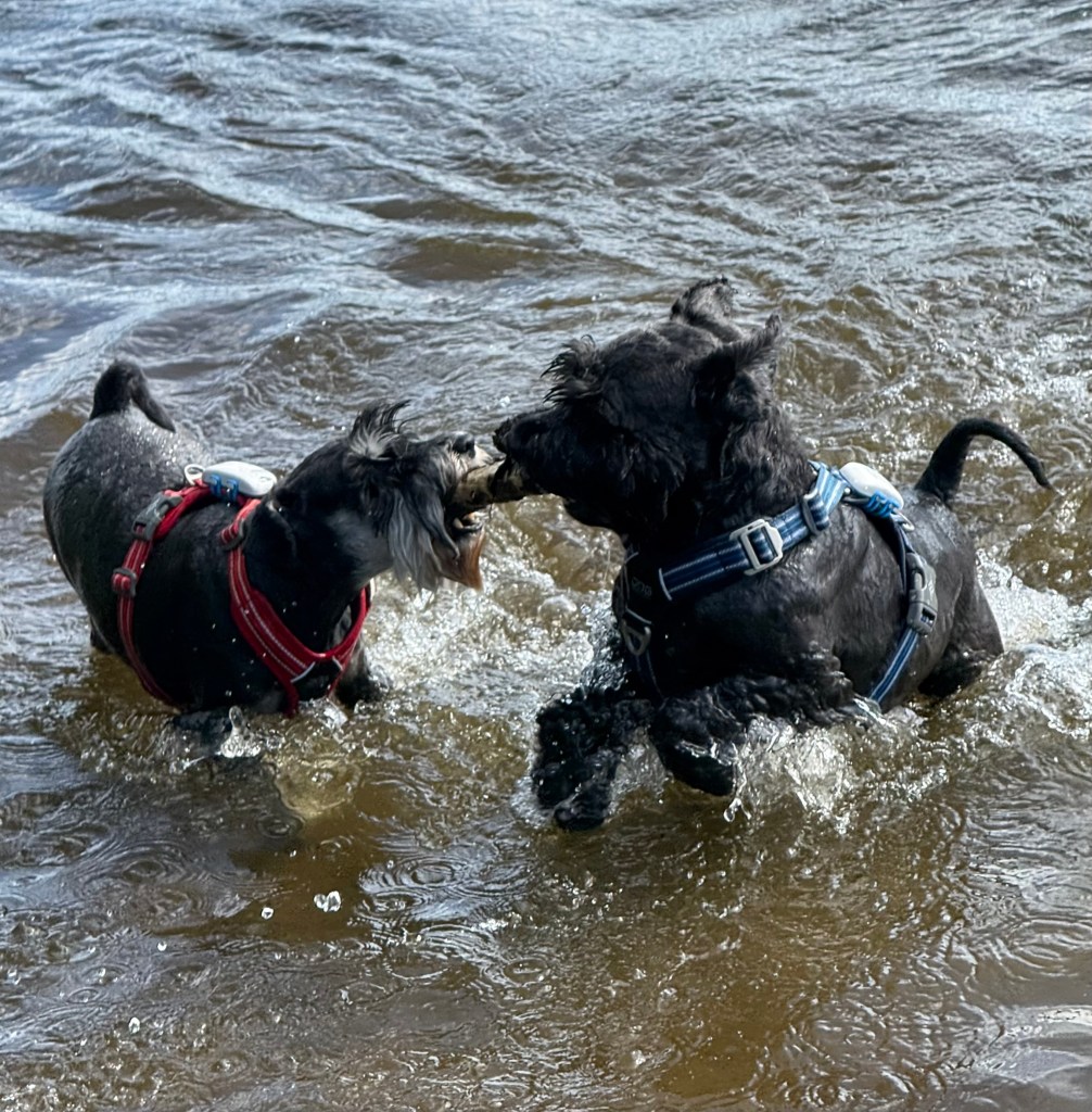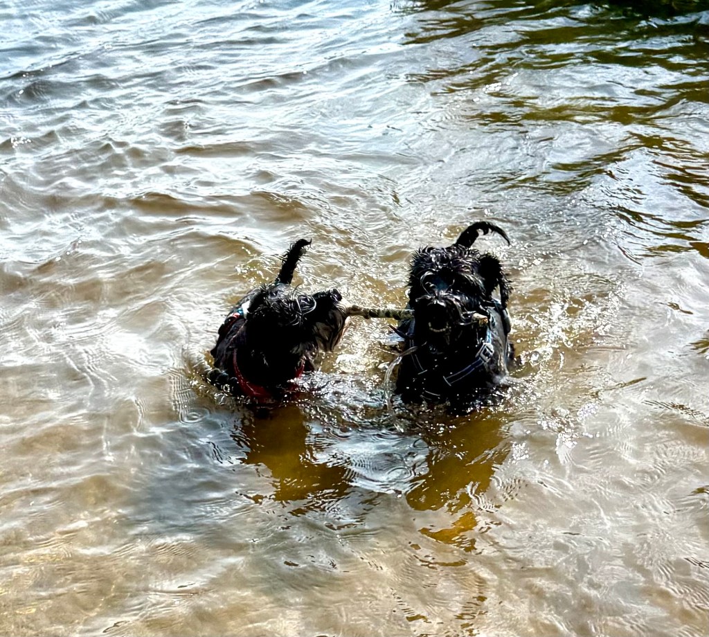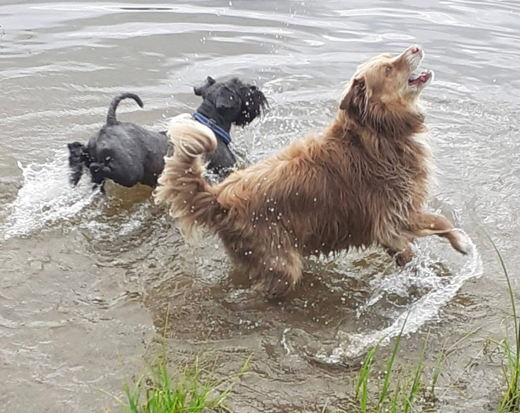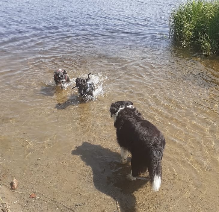 Underbart att fira med bad. Troy försöker lura matte att gå i och bada genom att lägga pinnen en bit ut och när hon går dit tar han den och flyttar den lite längre ut. Nä hä du skrattar hon det är inte tillräckligt varmt i vattnet än. Badkruka muttrar Troy.