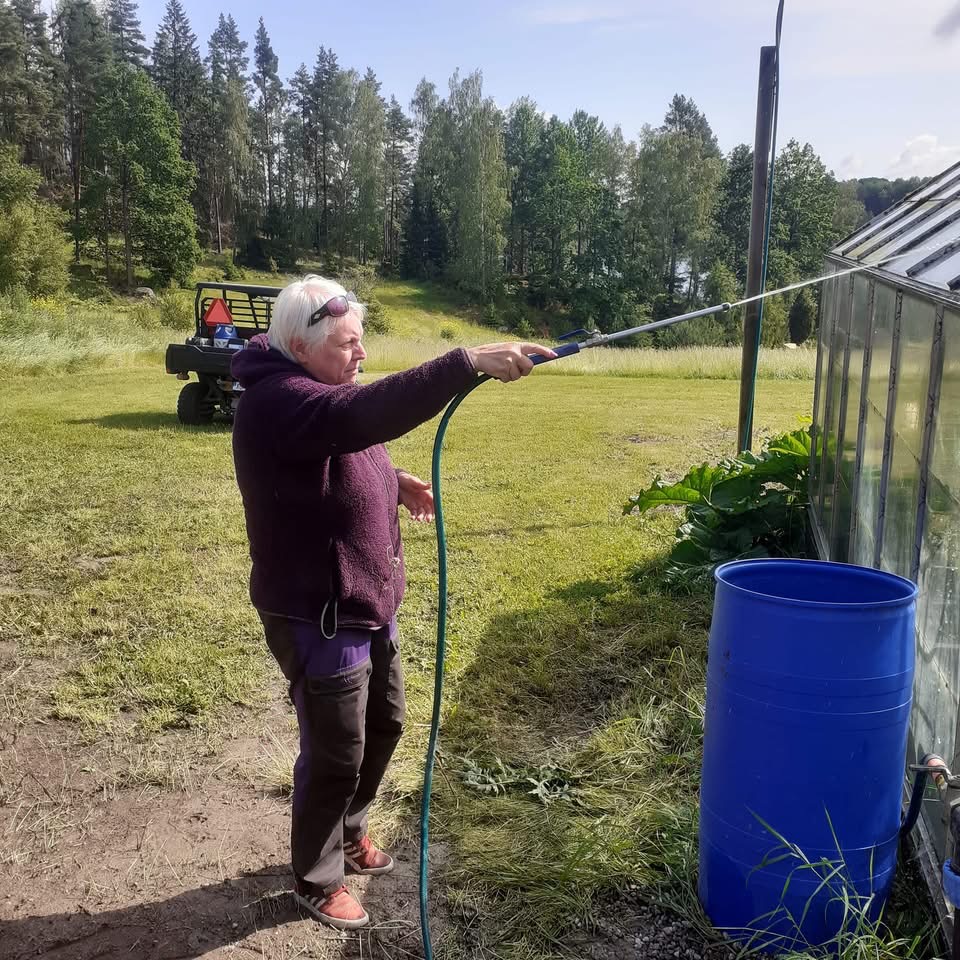 Mer jobb vid växthuset. Matte försöker spola bort mossa som växer i skarvarna mellan rutorna. Tråkgöra som tvåbeningarna håller på med.