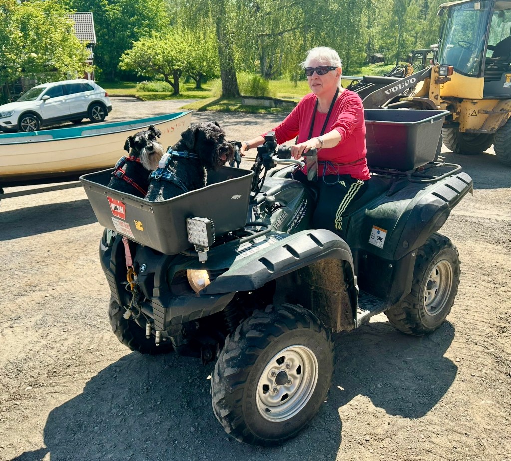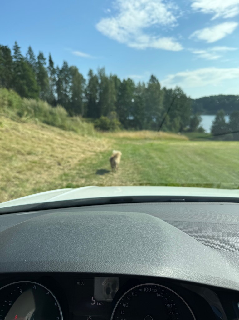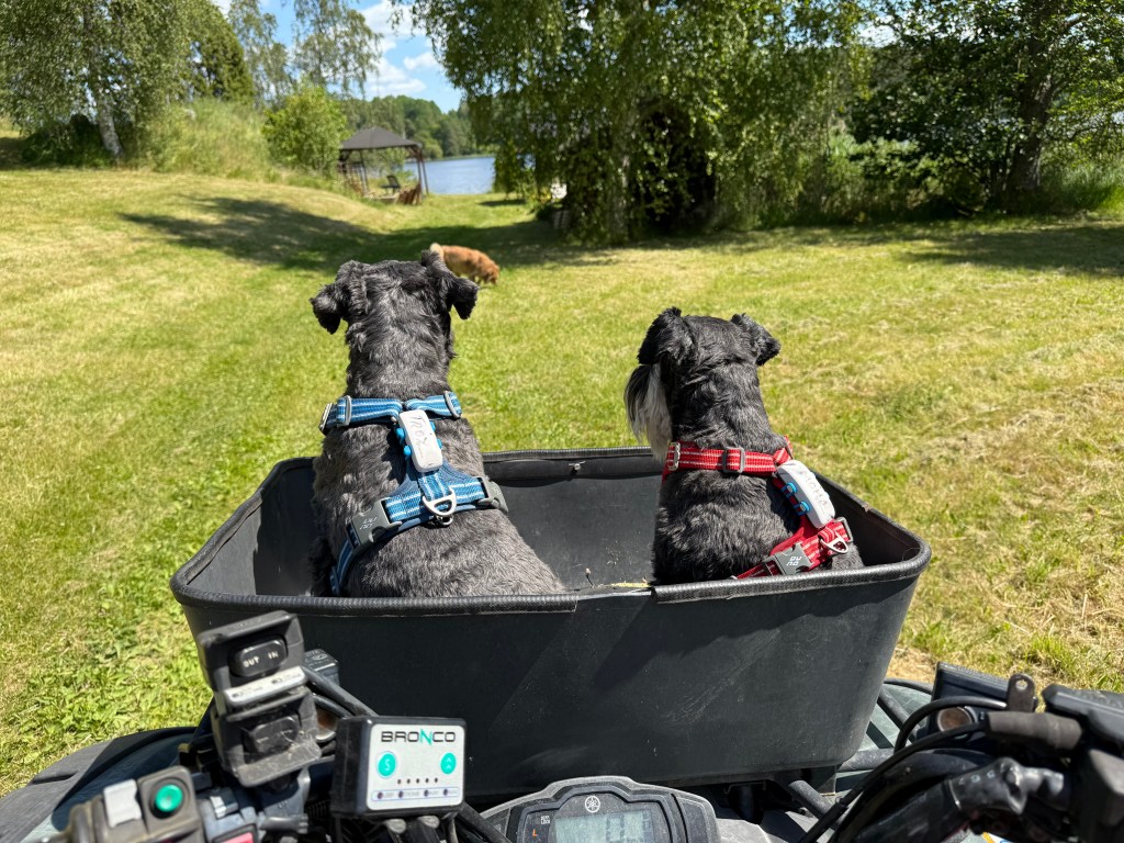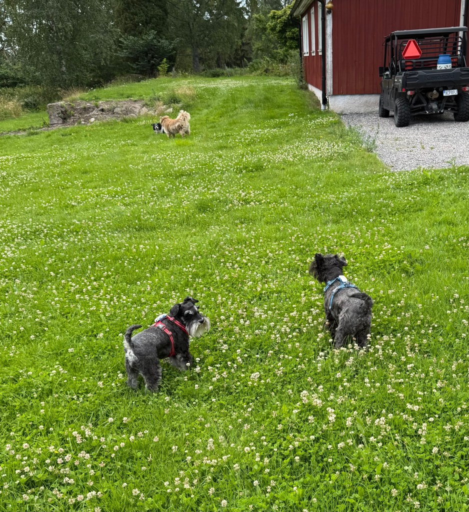 Sagt och gjort så far hon omkring och vi måste hålla koll på henne. Det tar tid för det är många stora gräsmattor. Jag åker med en liten stund och sen följer vi efter matte.