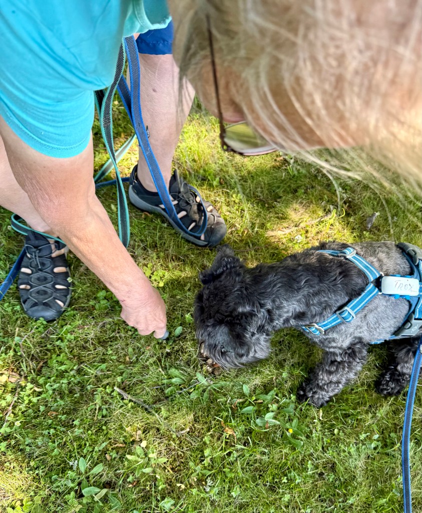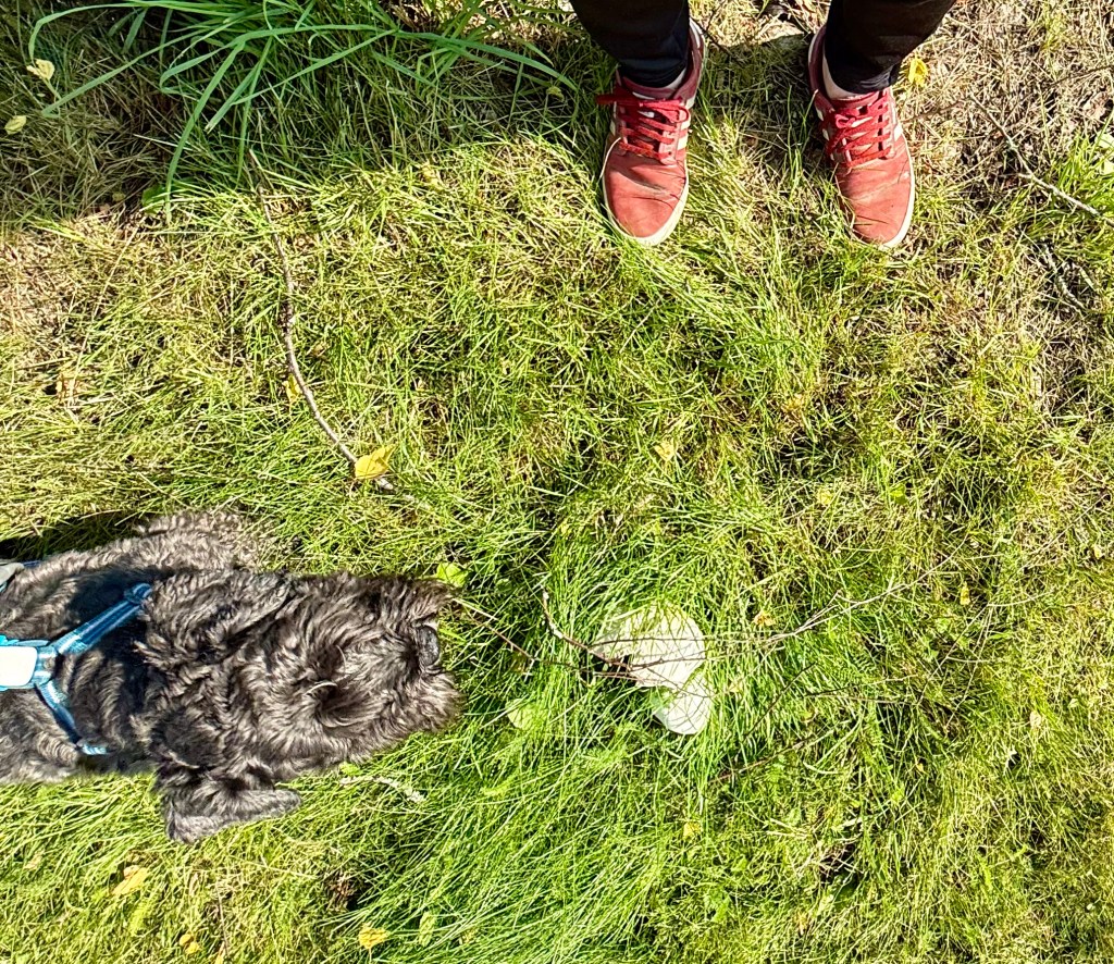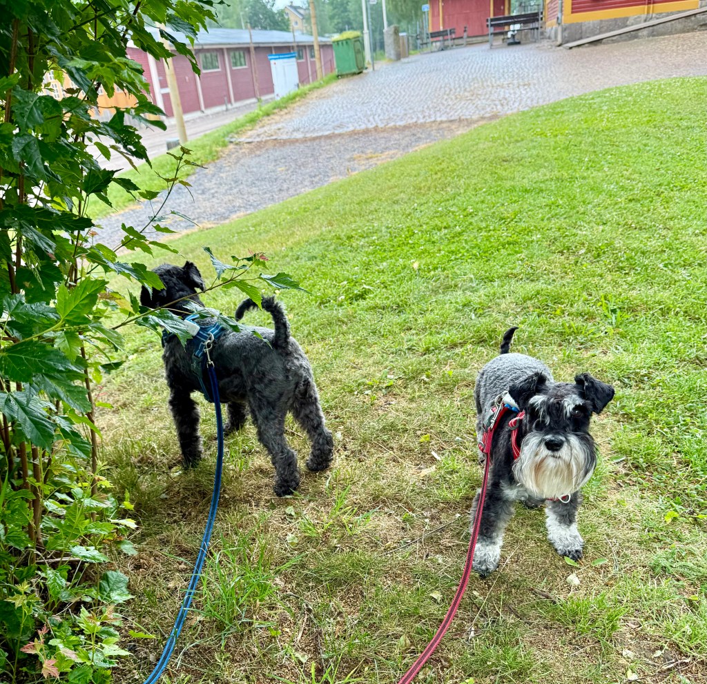 Sagt och gjort så far hon omkring och vi måste hålla koll på henne. Det tar tid för det är många stora gräsmattor. Jag åker med en liten stund och sen följer vi efter matte.