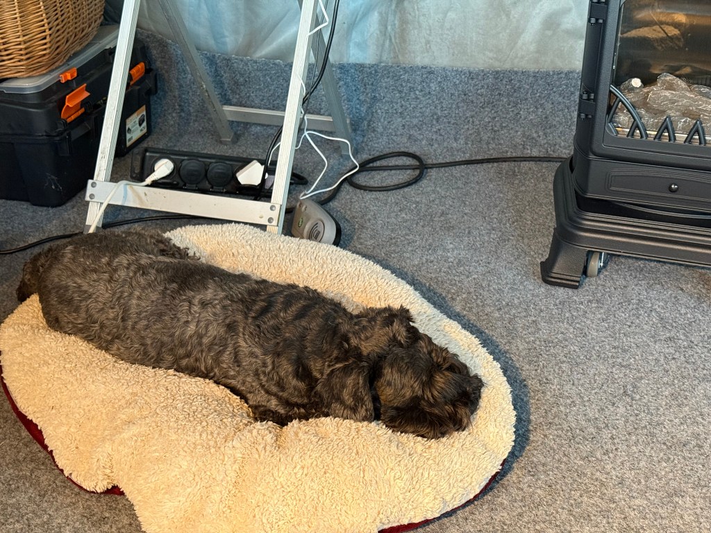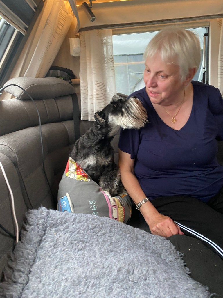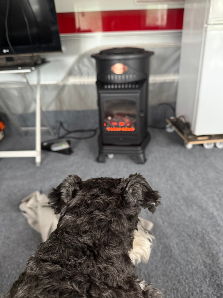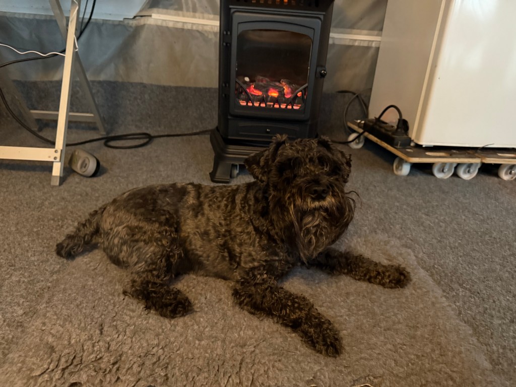 Blixt och dunder det åskar så vagn och förtält skakar. Störtregn 10 mm på en 5 min. Troy gick och la sig i en fåtölj med en filt över huvudet. Där somnade han gott.