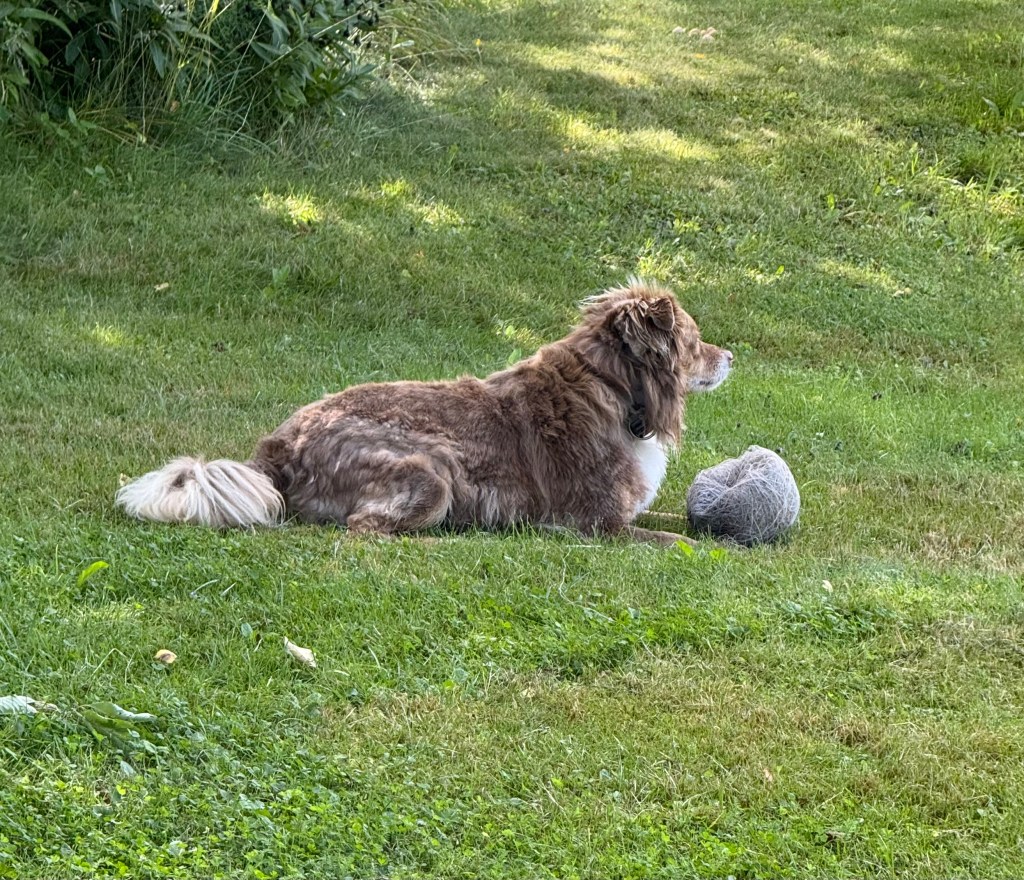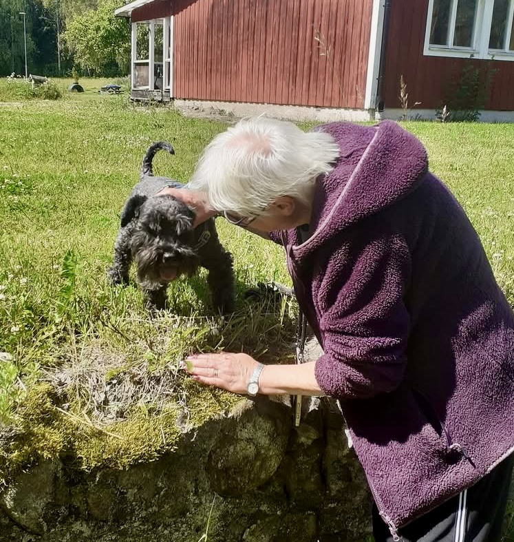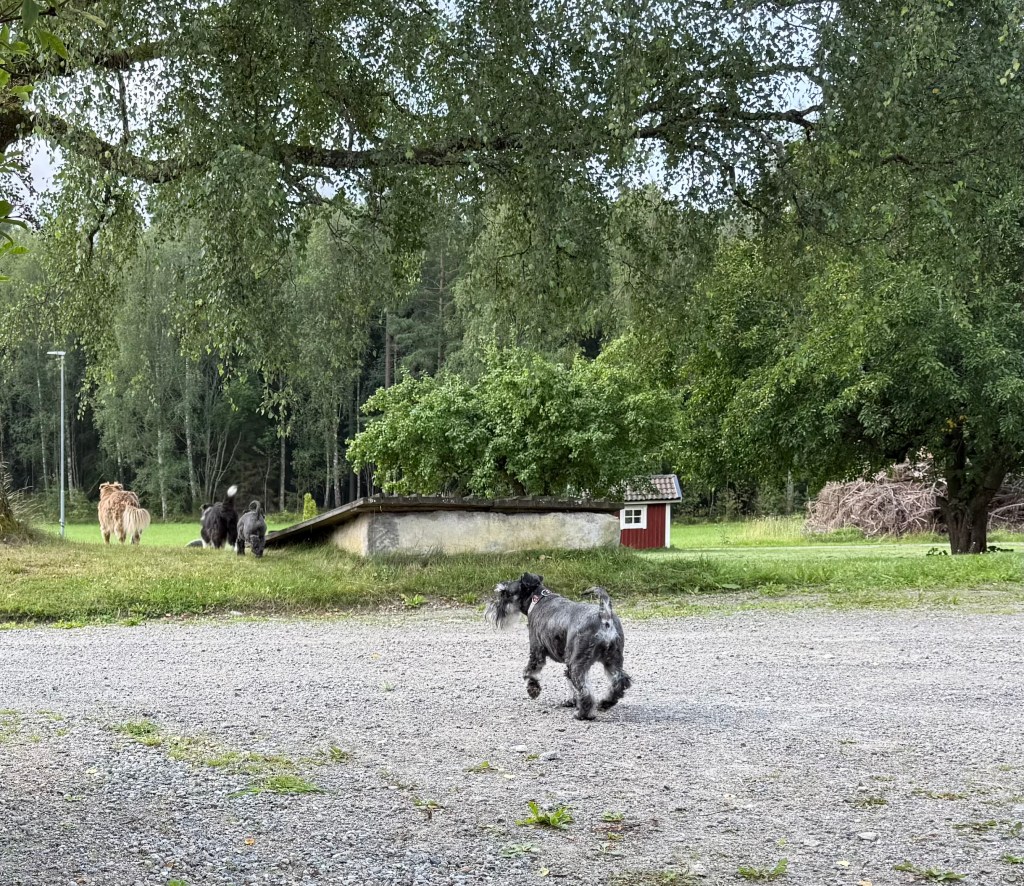 Matte håller på med att rensa bort brännässlor. Med jämna mellanrum kutar han dit till henne och frågar, vad gör du. Sen skall det kelas lite innan det är dags för att kuta runt lite.