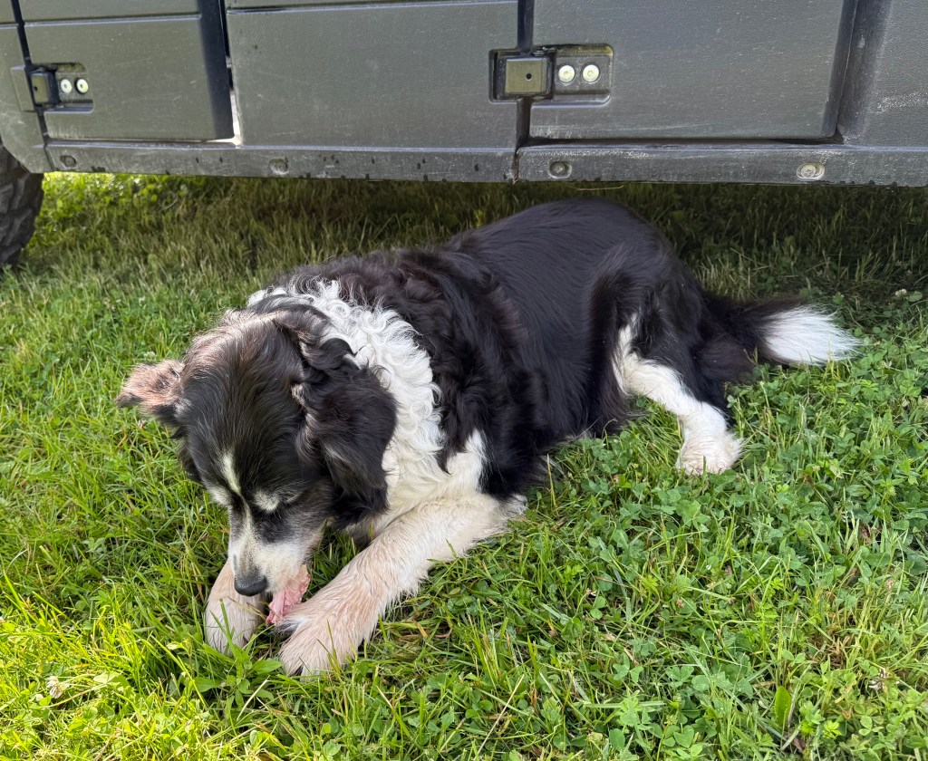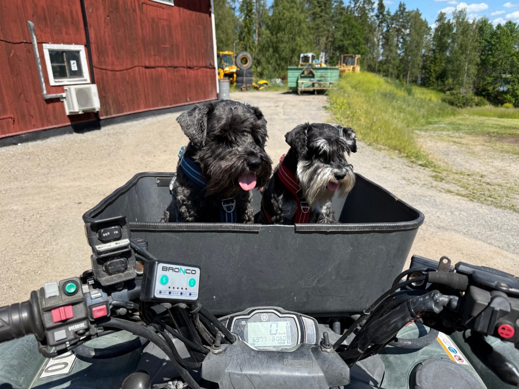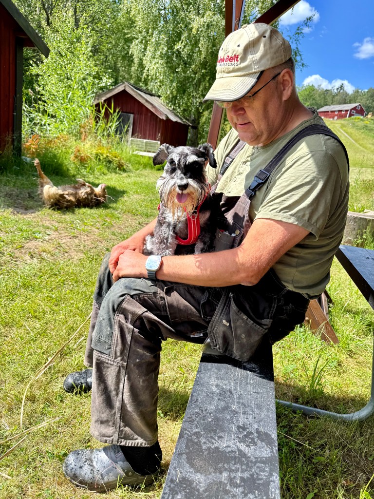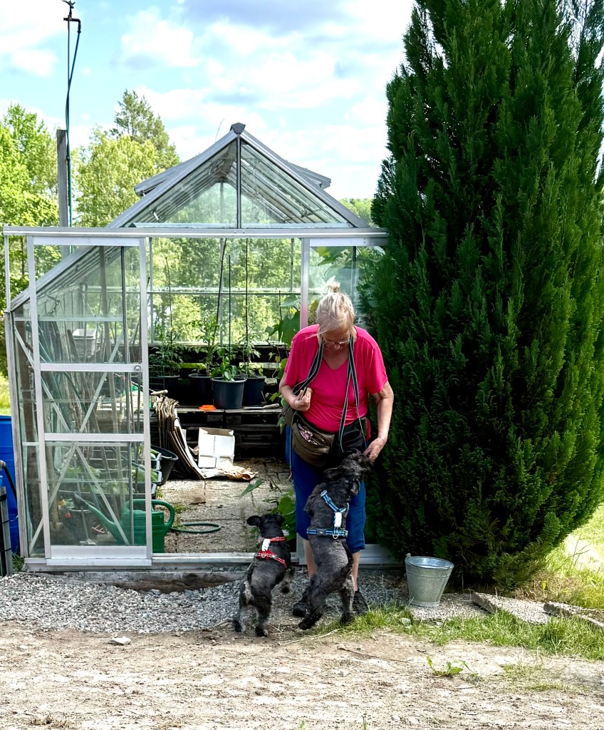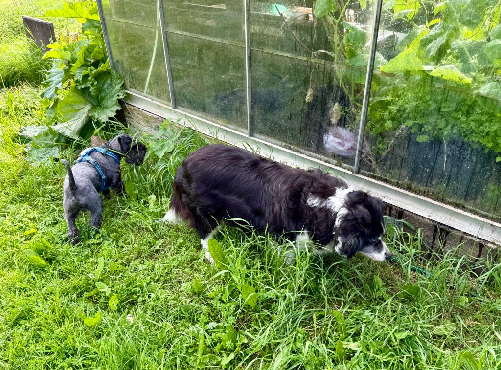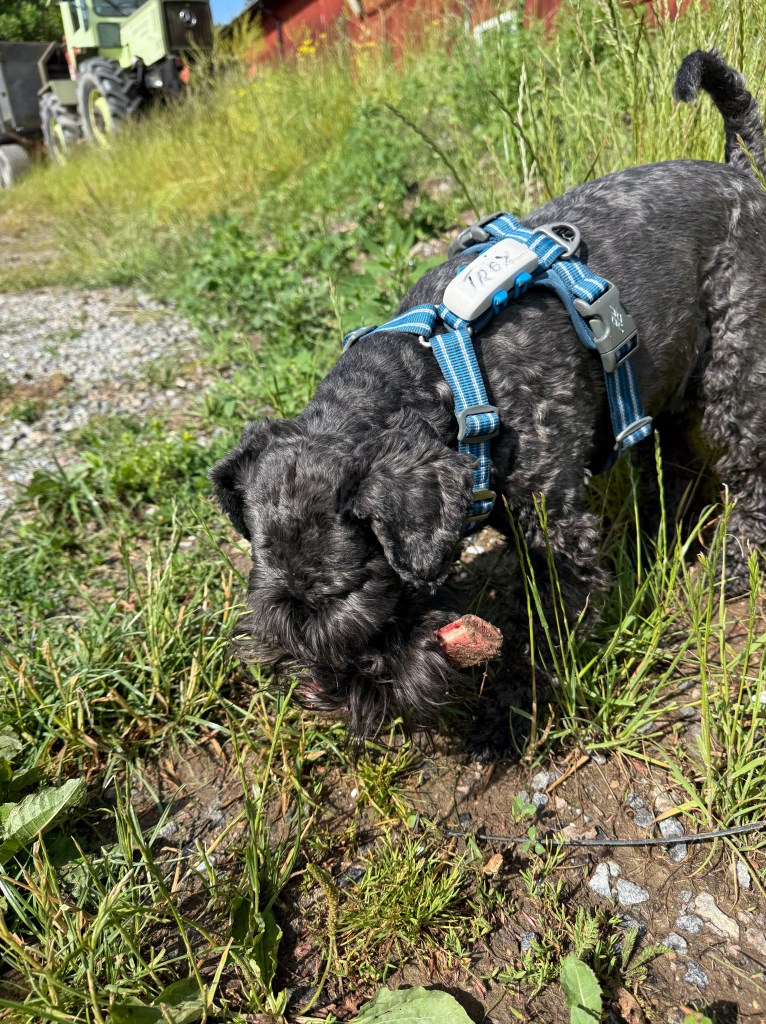 I dag skulle vi göra lite nytta hos Tommy. Helena fixar i växthuset och på odlingslotten. Tommy kör grävare, han lägger igen hålen utanför växthuset efter jobbet med att dra nya vattenledningar dit. Matte övningskör stora gräsklipparen och jag måste övervaka att hon kör rätt. Pass på matte, håll klipplinjen. När jag känner mig lugn på att hon klarar att köra den stora väsnande maskinen övergår jag till att kolla Helena och sen till Tommy för att återigen titta till matte. Det är körigt när de är lite utspridda, mycket springande blir det mellan dem. Troy kombinerar jobbet med att ha koll på tvåbeningarna med råttjakt.