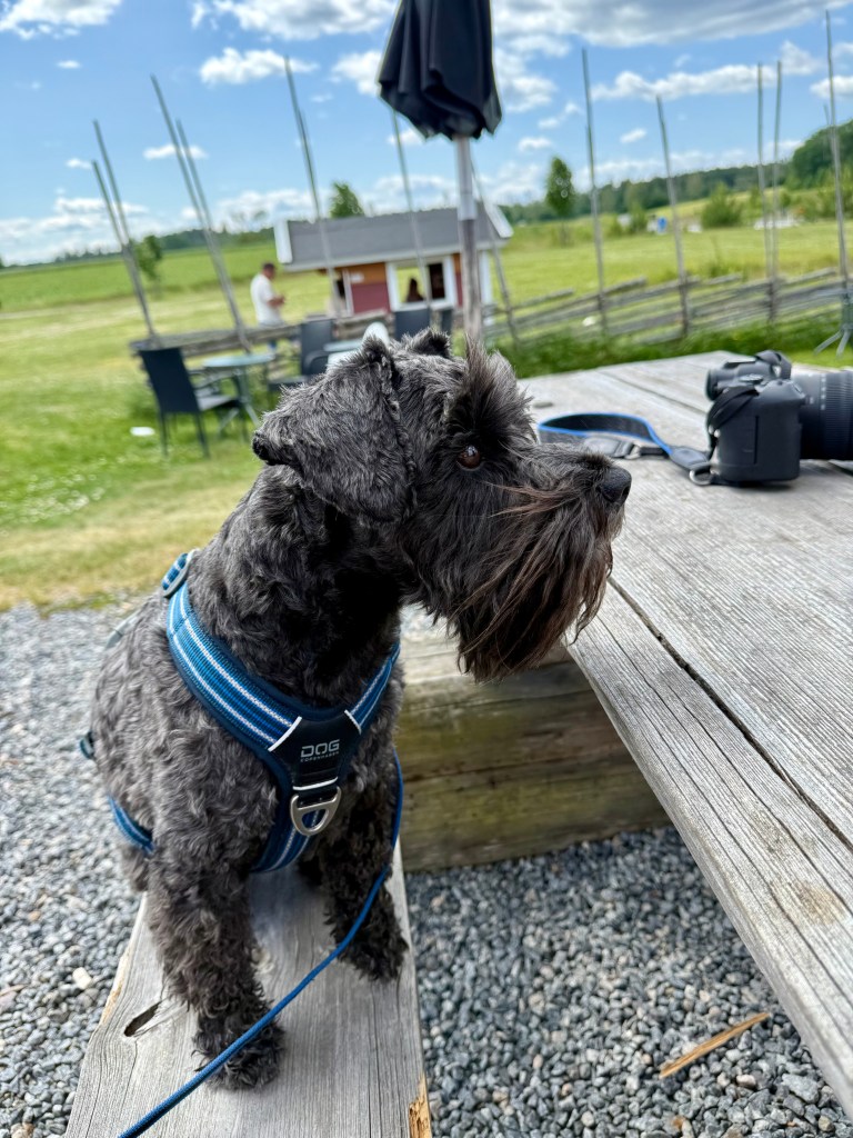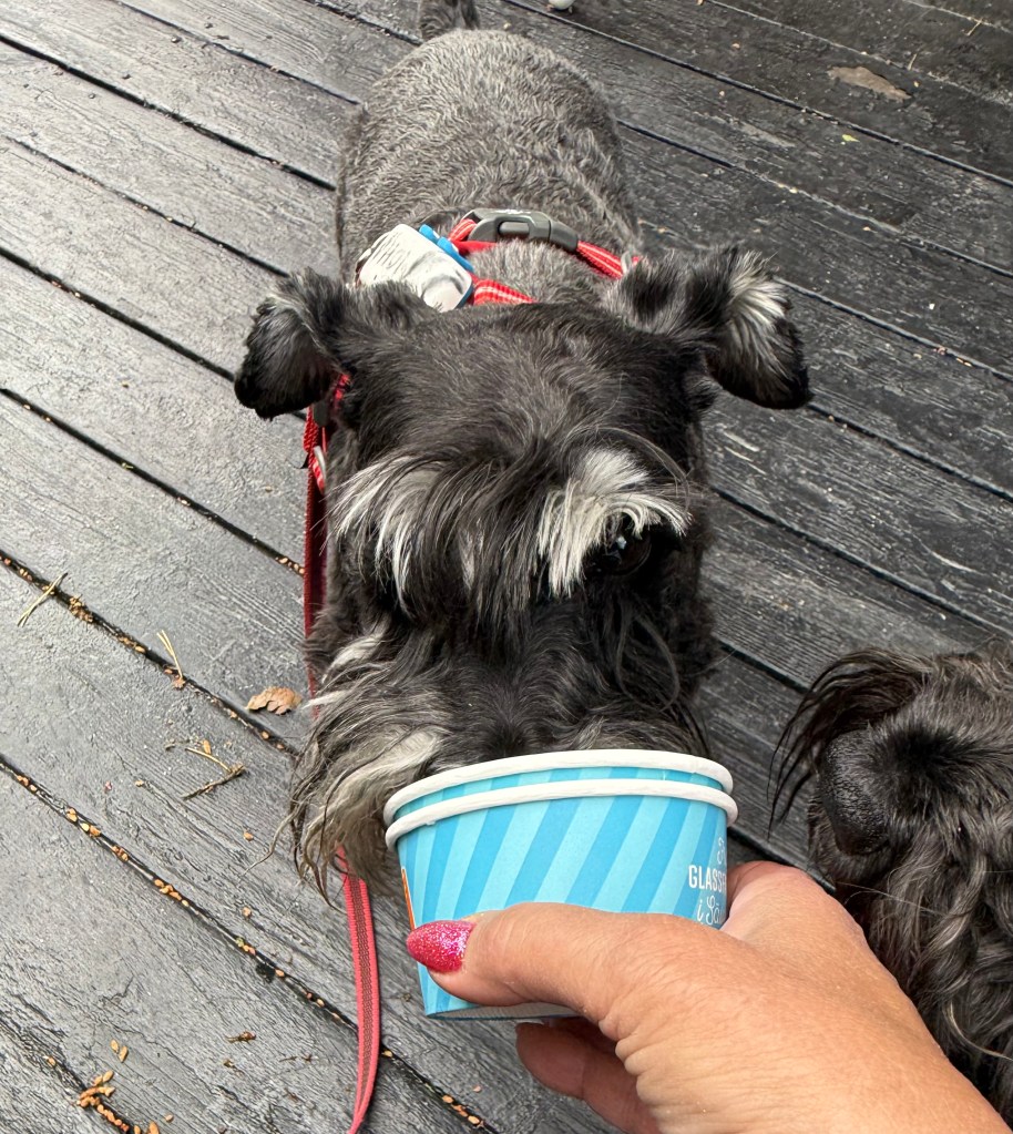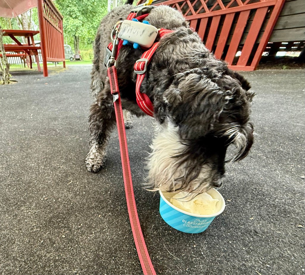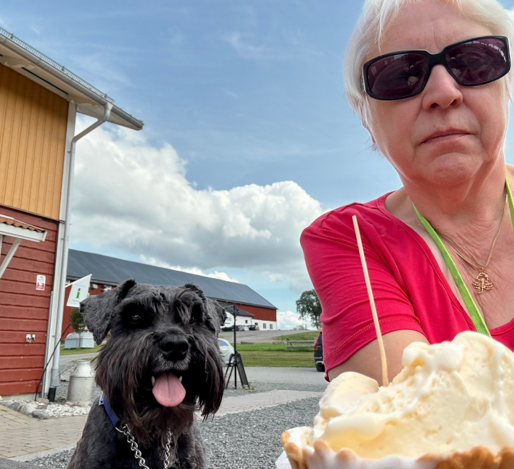 Nu är det något på gång. Helena försvann in på cafét. Det är dags att fira Wilmas hemflyttningsdag ni vet den viktigaste dagen i hundlivet. Vi i skogsröjsrgänget har en tradition att äta mjukglass den dagen.