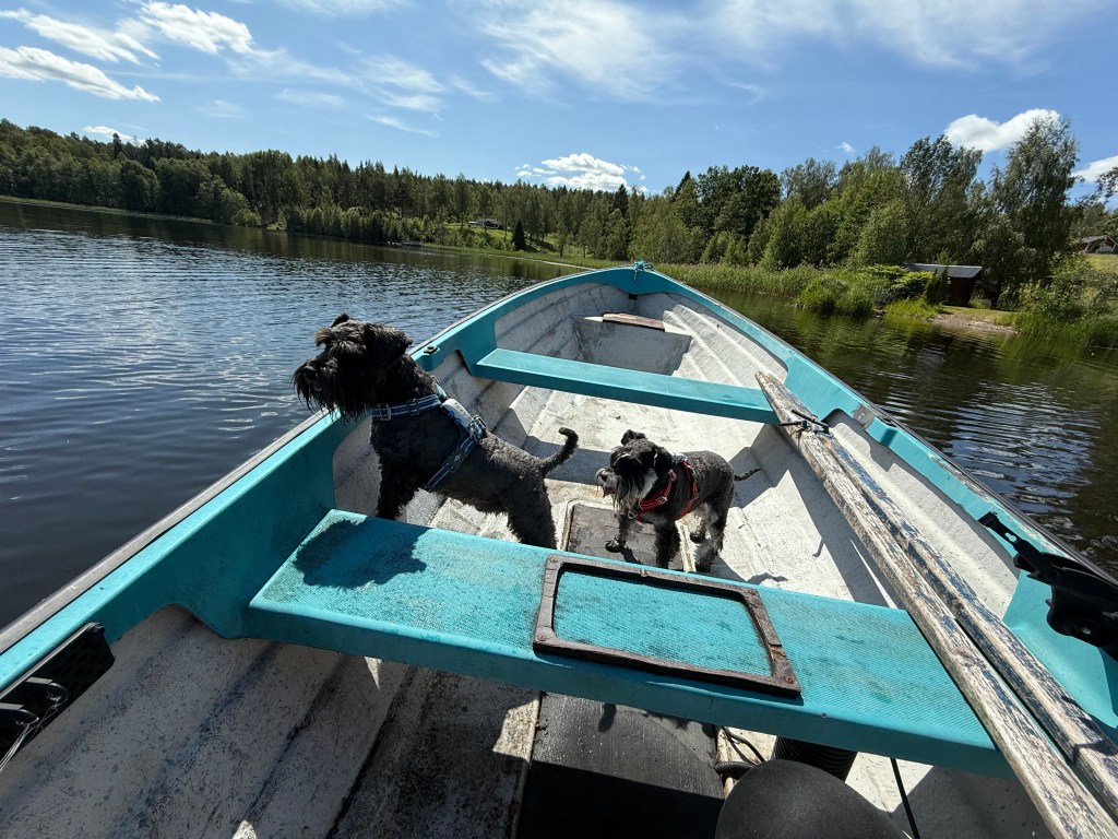 Nu är allt klart för sjösättning och för att åka ut på böljan den blå. Matte vi åker båt på landbacken. Lite läskigt är det. Jasså du säger det att det är lugnt.