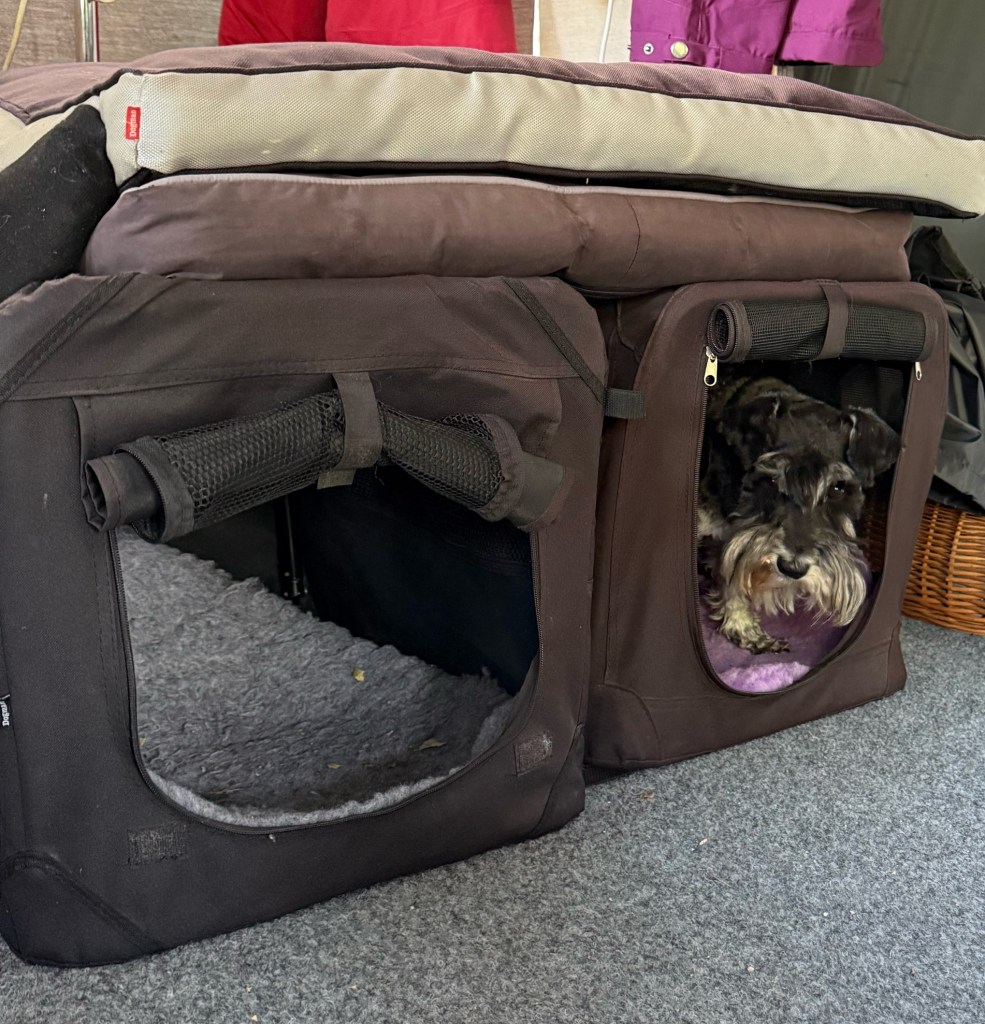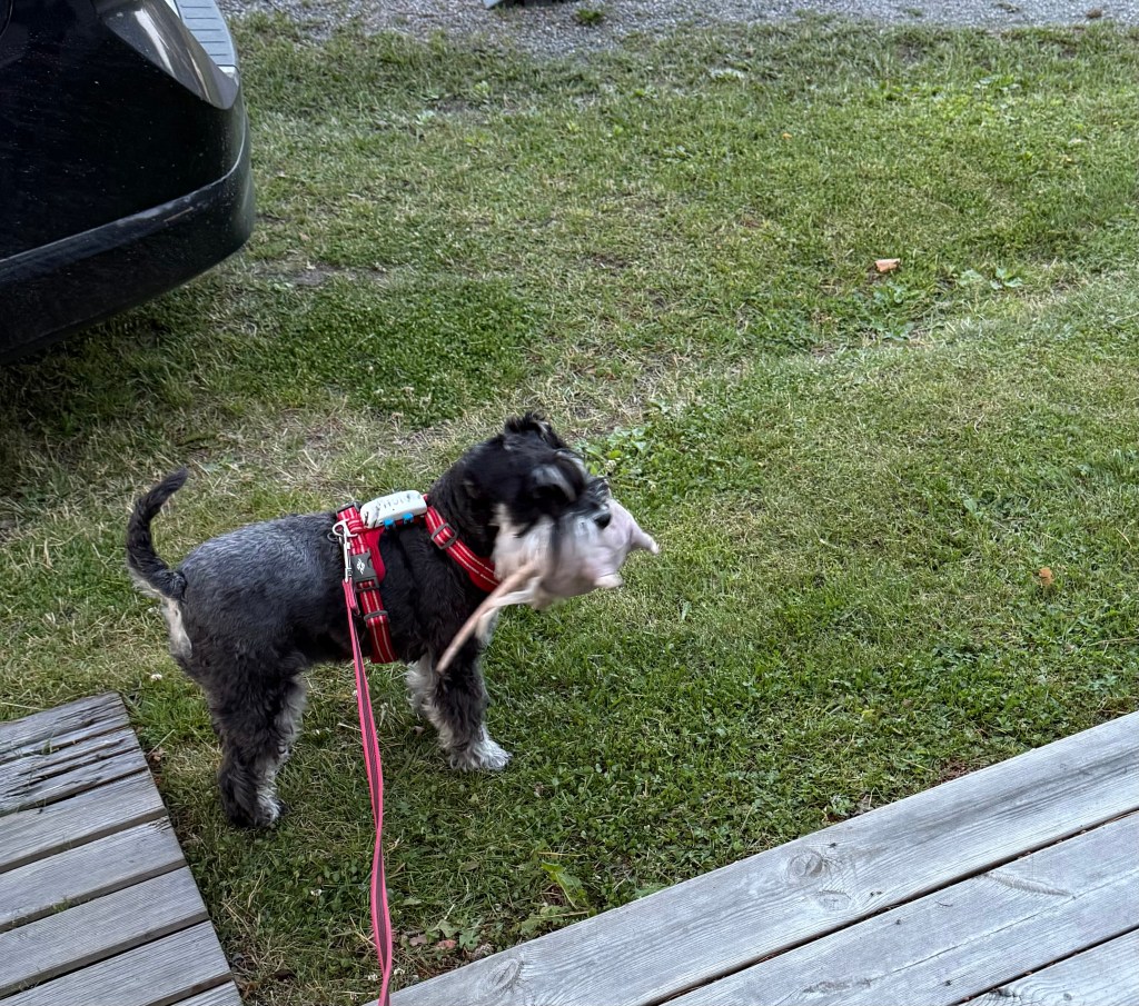 Vi var och sa hej till våra grannar och när jag kom in i deras förtält för att umgås lite fick jag syn på en underbar bege råtta som låg och lurade i en hörna. Jag pekade med nosen på den och sen satte jag mig riktigt fint med huvudet lite på sned och höll upp ena tassen samtidigt som jag tog ögonkontakt med Anneli. Tänk att Annelie förstod att jag frågade om jag kunde få den och hon underbara människa sa ja Moha, ja varsågod du får den. Matte… hon skall med hem till sängen och sova ihop med mig och Råttis.