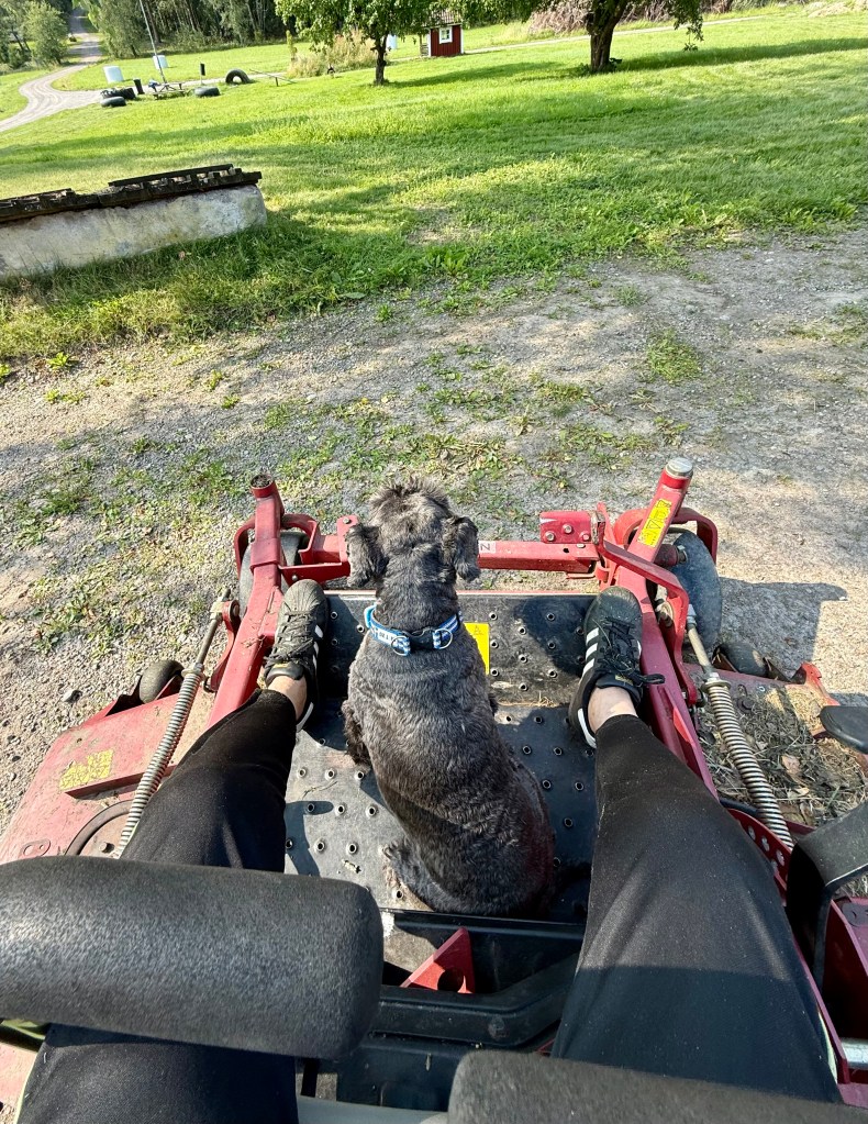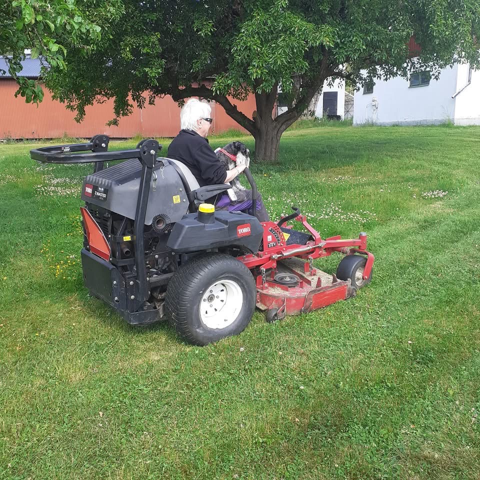 Min kompis Tommy stack iväg på ett viktigt ärende. Troy sa till matte att kom igen så kör vi gräsklipparen. Han hoppade upp och pekade med säker tass var det skulle klippas.