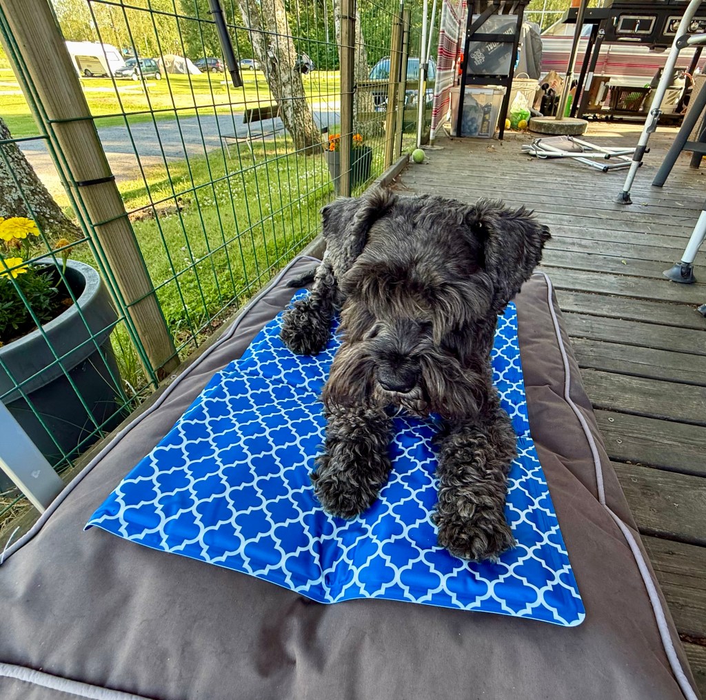 I skuggan på trallen där det fläktar lite är det alldeles utmärkt att ligga på en kyldyna.