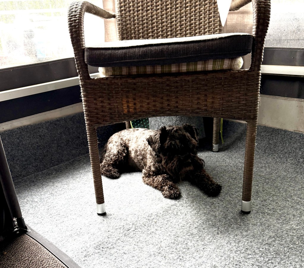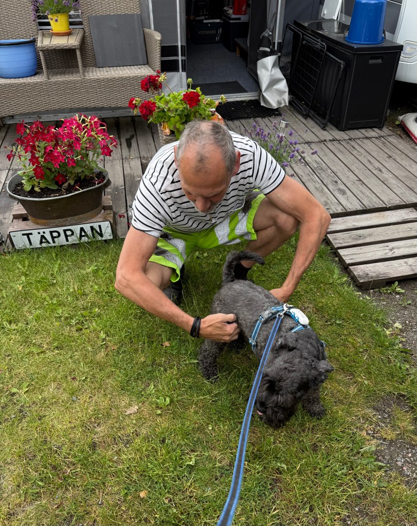 Här är det upp och ned vända världen. Delar av golvet i förtältet måste bytas ut. Våra grannar Nisse och Micke byter golv och sen en ny konstgräsmatta. Den är ganska skön att ligga på och jag tar plats i skydd under en stol