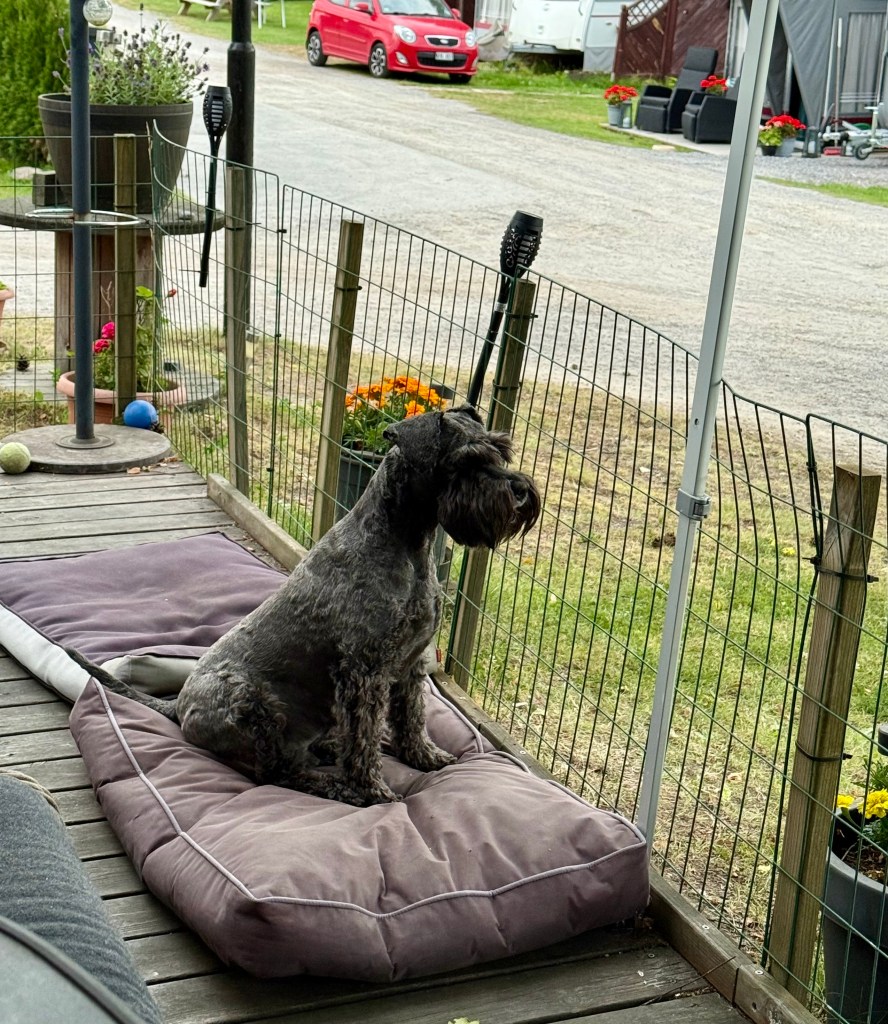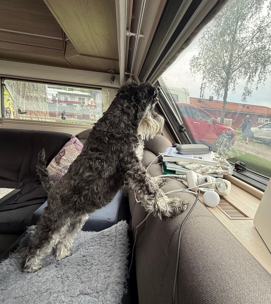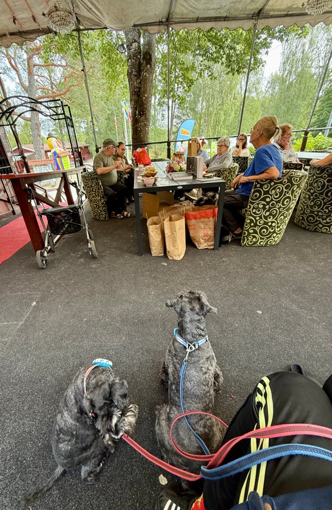 Sen var det dags för träff på campingens restaurang där Helena hade boksläpp på sin roman. Mycket mingel med människor och hundar. Vi har full koll på bordet för det finns en skål med leversnittar där.