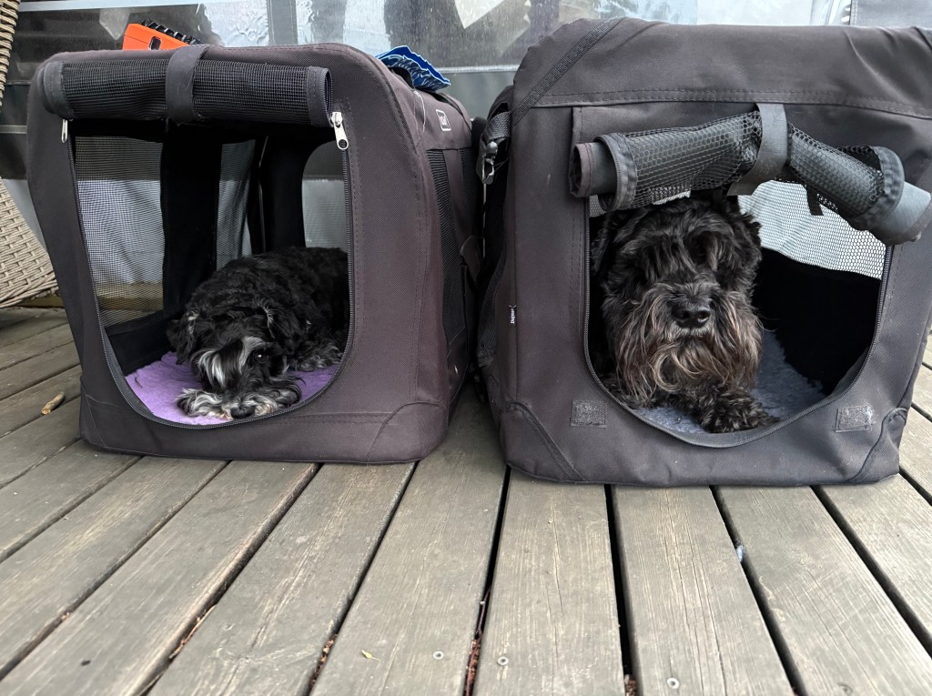 Troy älskar att åka på fotplattan han kliver ogärna av. Här på bryggan är det trångt så det blir bättre om vi får åka med.