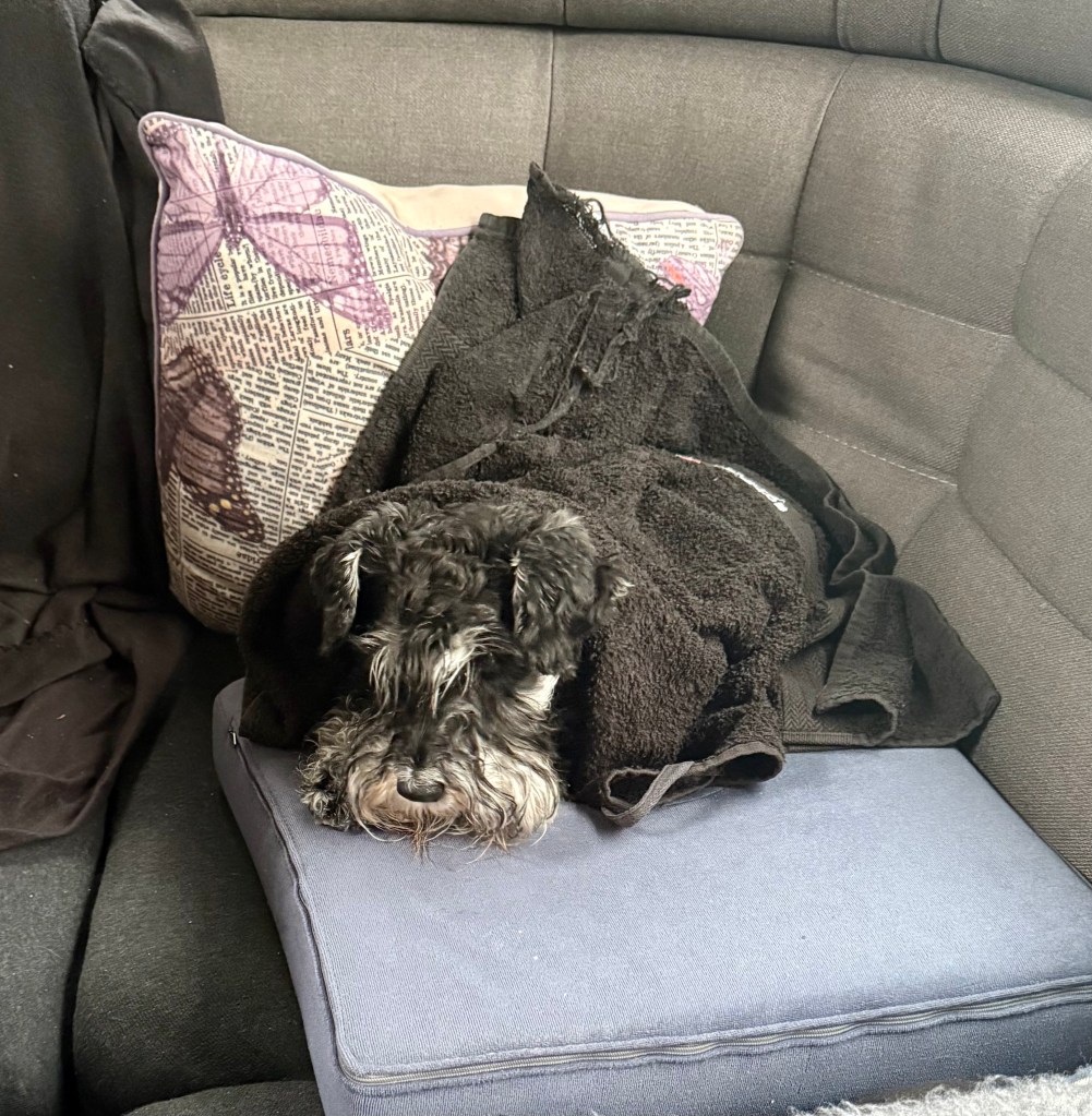 Ja ha man tvingas upp från sängen och ut i regnet för morgonturen. Väl tillbaka i vagnen fryser jag som bara den. Fick en handduk som filt och då blev jag sakta varm igen.