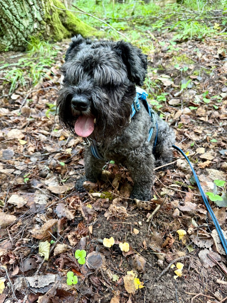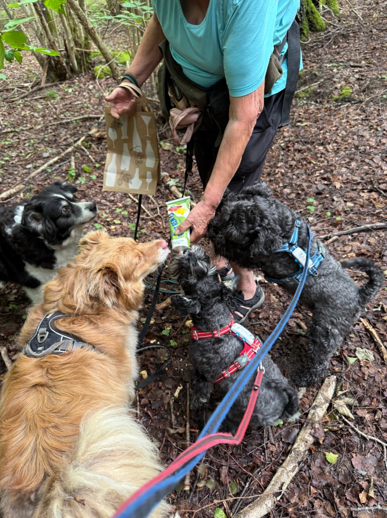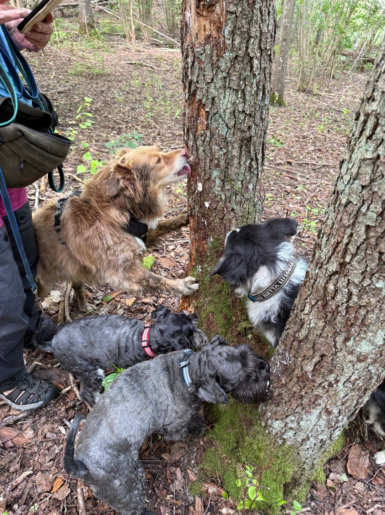 För tre år sen tränade vi på att hitta tryffel. I dag gick och letade men hittade inget. Men Troy stannade kvar och petade med nosen i backen sen satte han sig ned tittade på matte som sa? vad har du hittat? Å se på tusan där stack en pytteliten tryffel upp huvudet, som vi andra missade. Han satt lugnt kvar för att invänta sitt godis. Helena och matte blev djupt imponerade av att han kom ihåg doften så pass långt efteråt. Tittar du noga på bilden ser du tryffeln alldeles bredvid Troys nos.