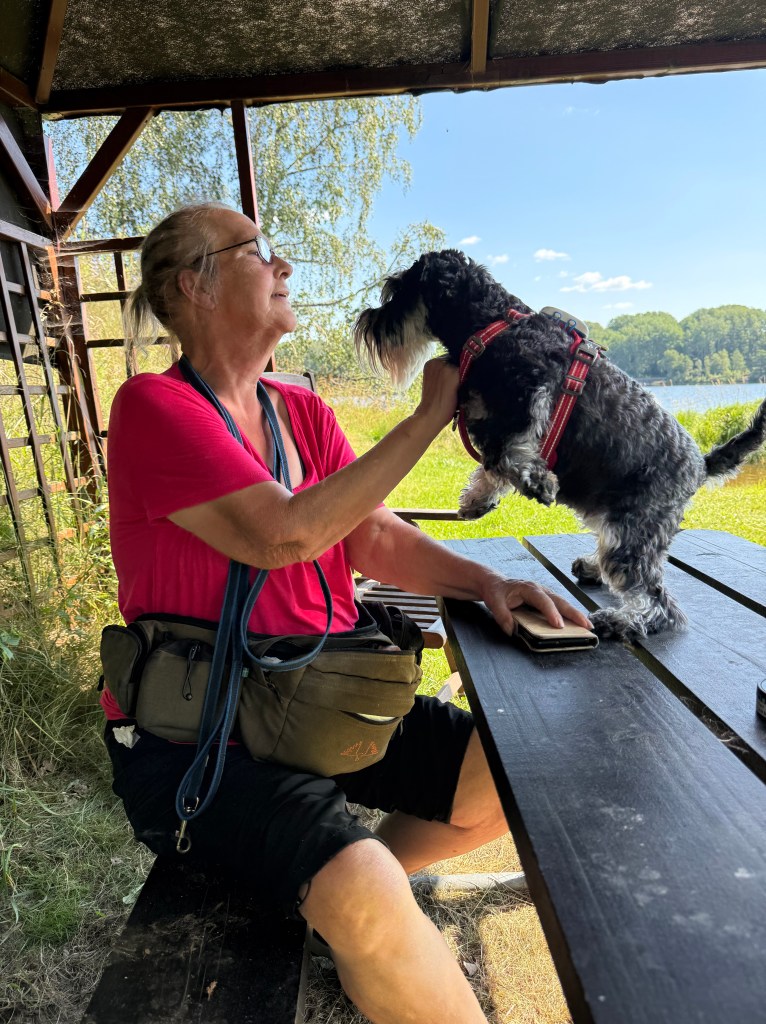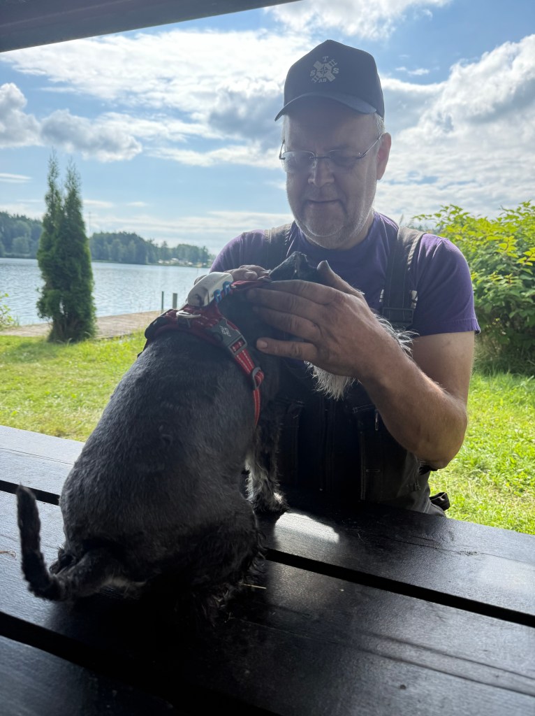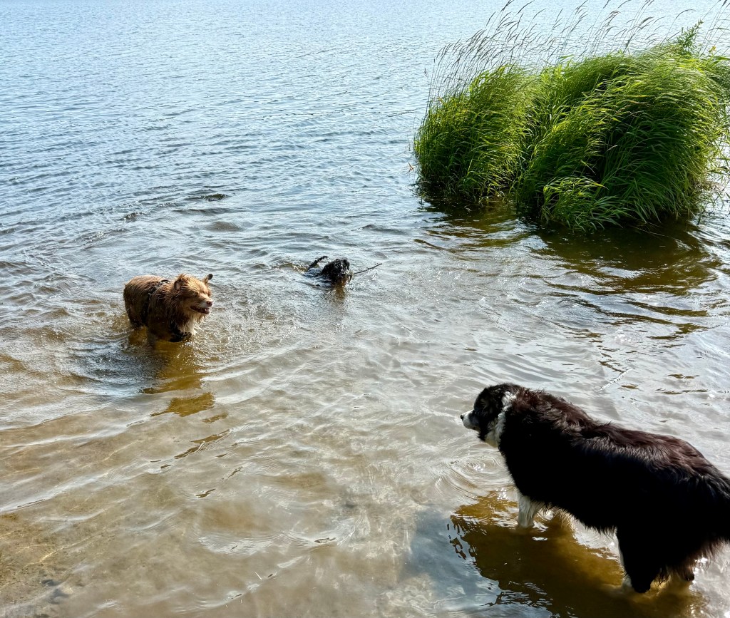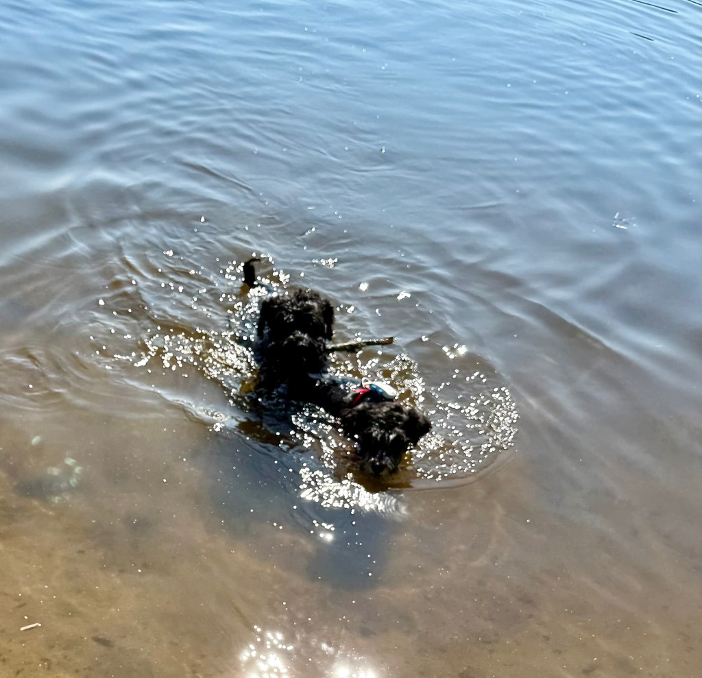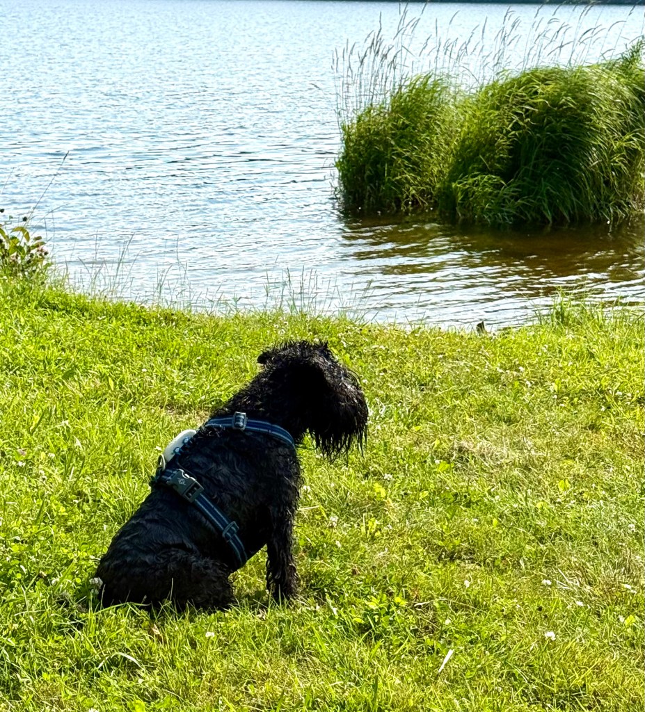 24 grader i luften och 21 grader i sjön ja då går även Moha i och simmar.