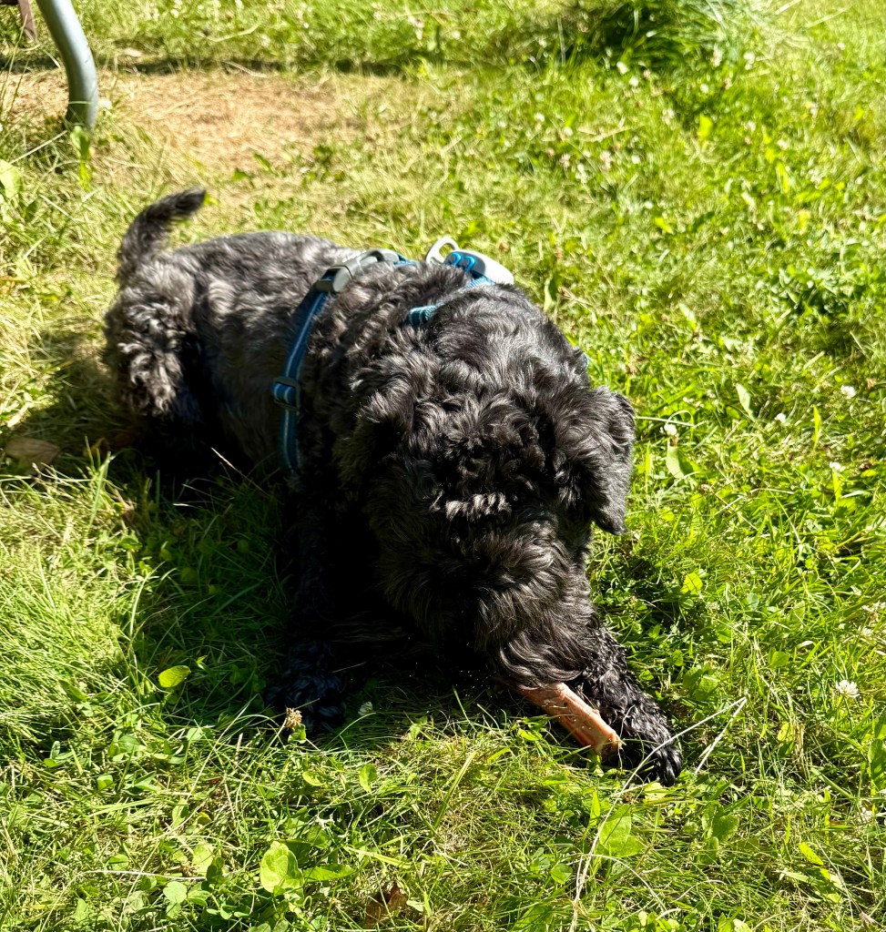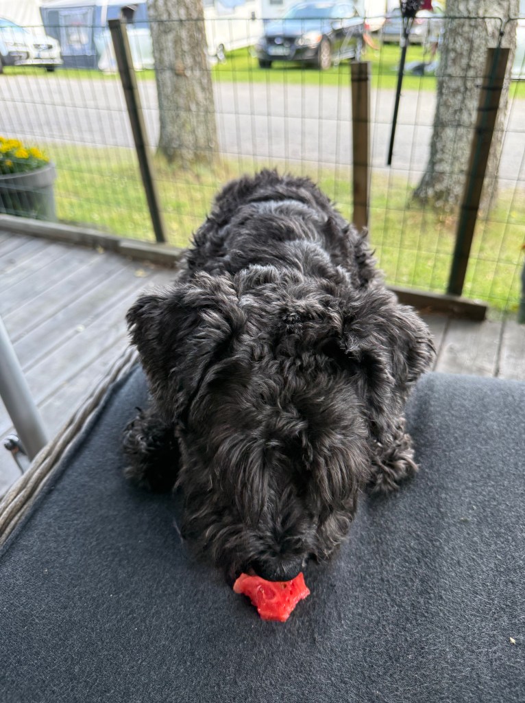 Helena bjöd på tuggstickor och det passar väldigt bra efter badet. Man ligger i solen och torkar samtidigt gnager man på en tuggsticka nom nom nom. Moha sa Troy är du färdig med din tuggsticka? Nä du får inte slumpen så det så. Tjaskigt sa Troy och snodde åt sig en liten bit iallafall.