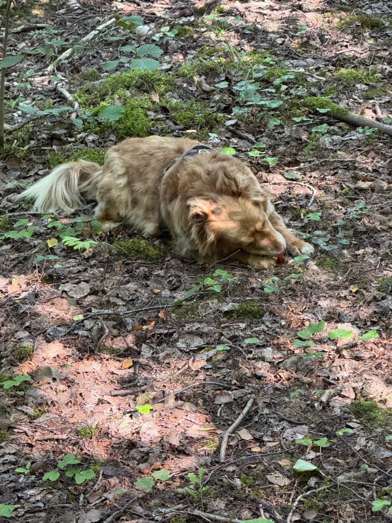 Vidare för att leta kantareller. Det blev bara några stycken bleka sådana. Mattarna och husse fick en macka med den stekt. Troy var mer intresserad av gofisstenarns, dom fanns kvar sen förra gången.