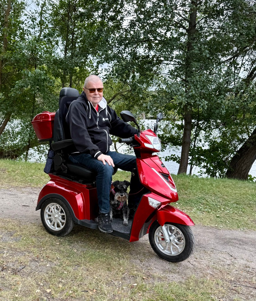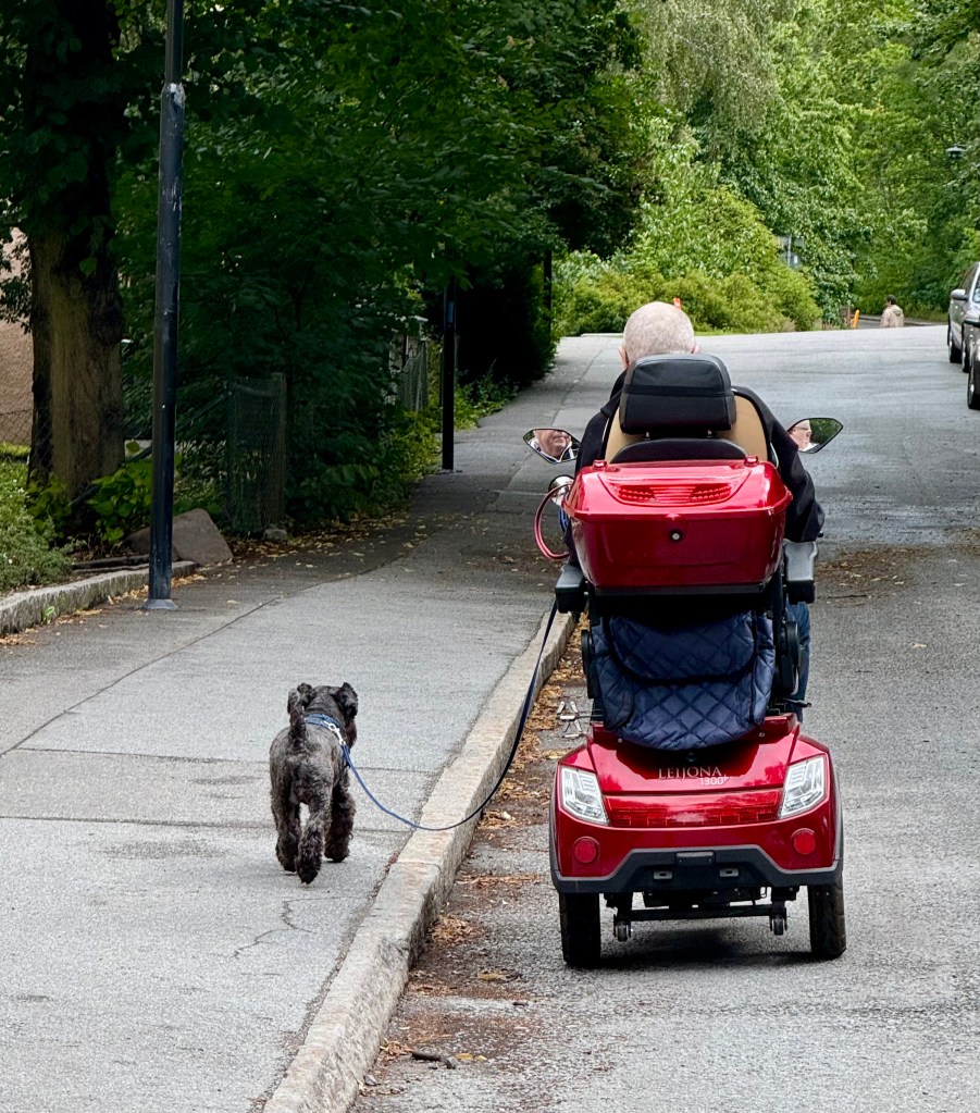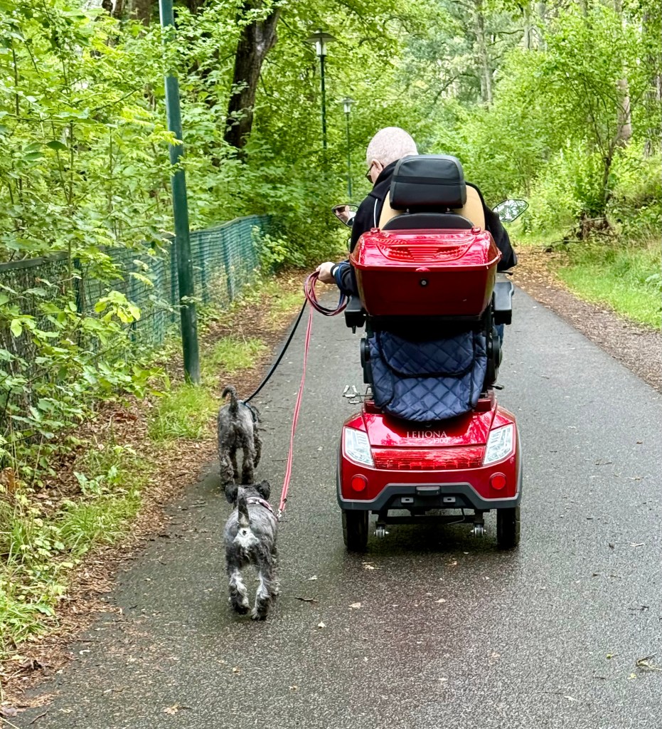 Matte skall få ett nytt knä och kanske inte kan åka ut med oss de första dagarna så jag tränar husse på att köra moppopeden. Det går väldigt bra husse är duktig.