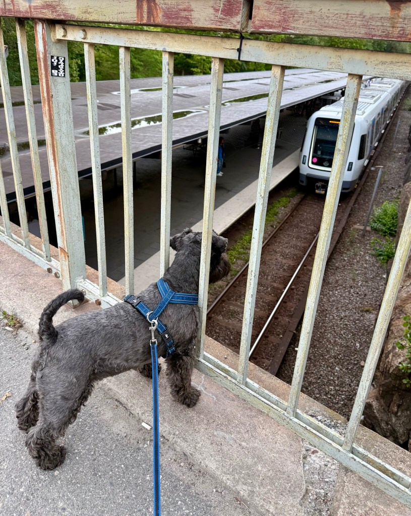 Husse är ute och åker spårvagn. Där kom det en och vi tror han är med på den. Jo där kommer han gåendes.
