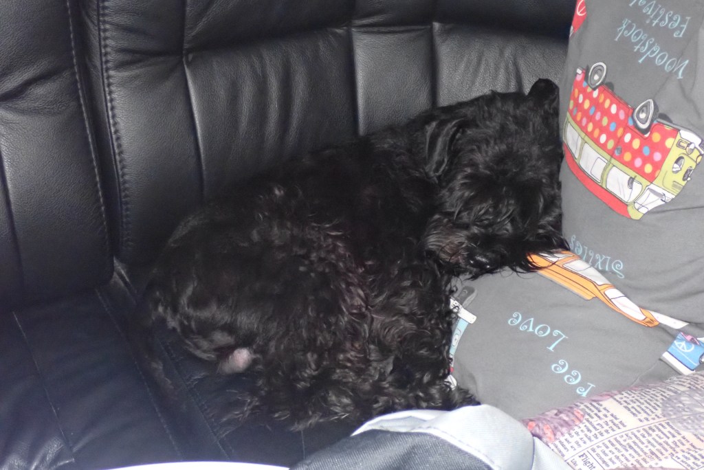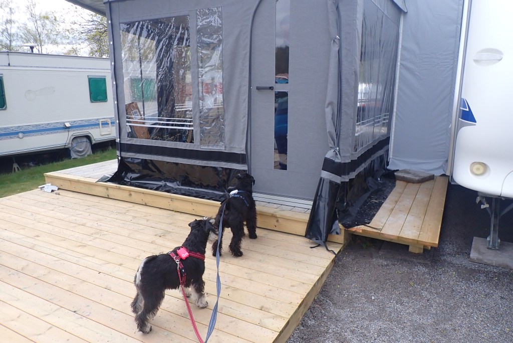 Efter hundträffen och besök i Staffan och Crillans vagn gick vi till våran vagn men det tog lite tid eftersom vi måste hälsa på alla som bor på ”vår gata”. Jag har krupit in i mattes tröja och nu skall jag sova sju kvart i timmen på soffan i förtältet.