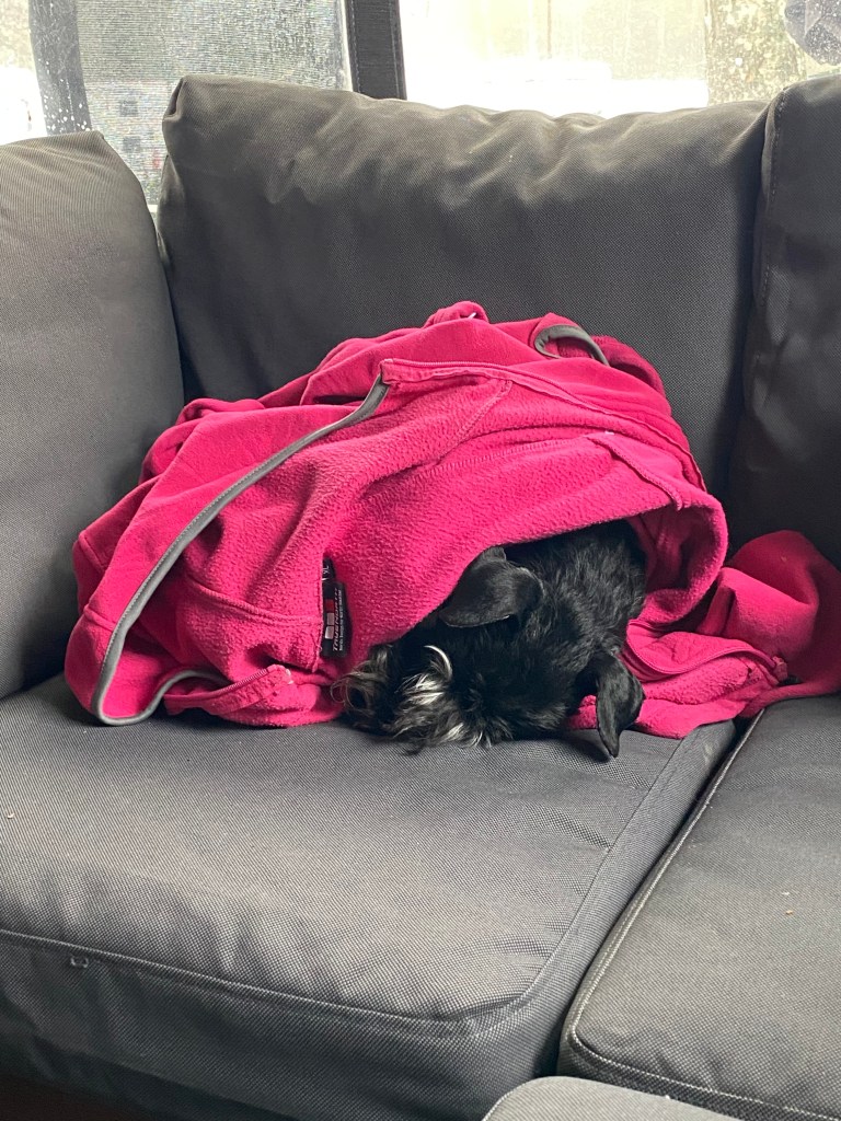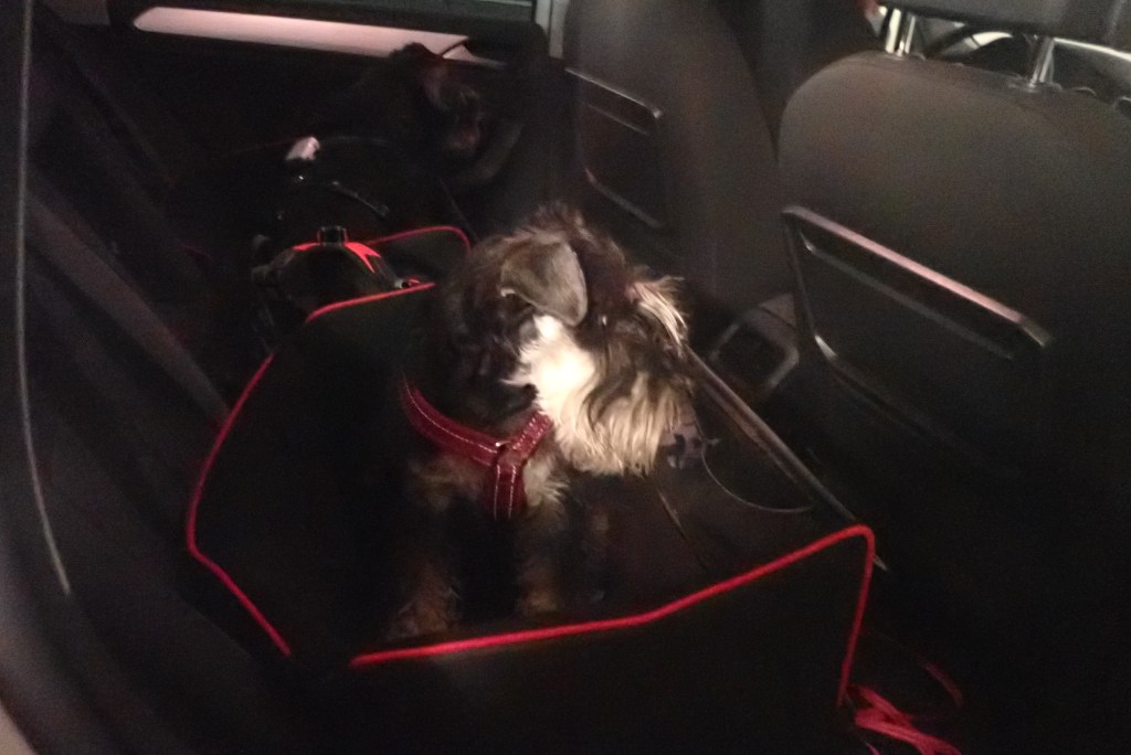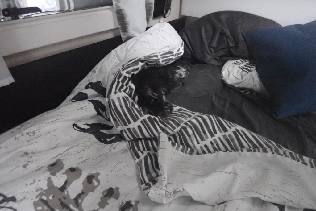 Troy har gått in i vagnen där han dunat in. Han är inte nåbar för världen inte ens när det går hundar förbi vagnen.