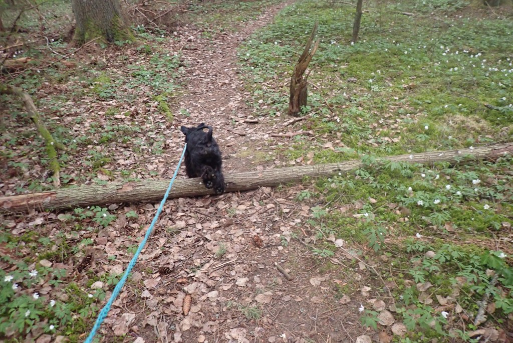 Efter att ha packat in kassarnas innehåll i vagnen gick vi en promenad genom trummslagarskogen. Fullt av vitsippor och många balansstockar. Godis matte, godis!