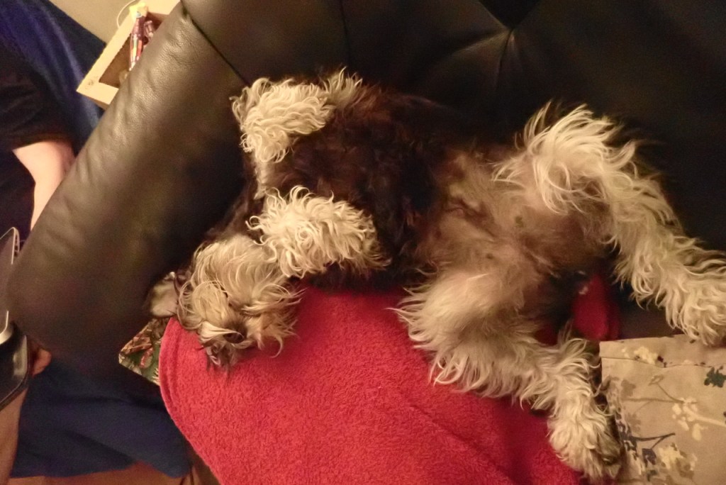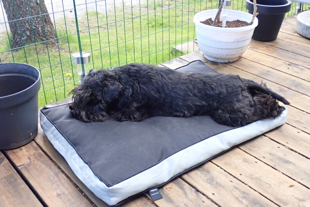 Matte skulle iväg och handla efter vår promenad. Jag tog min plats i soffan för att vila en liten stund. Ute regnar det och då är bästa sysselsättningen att ta en liten tupplur har man tur har det slutat när man sovit klart.