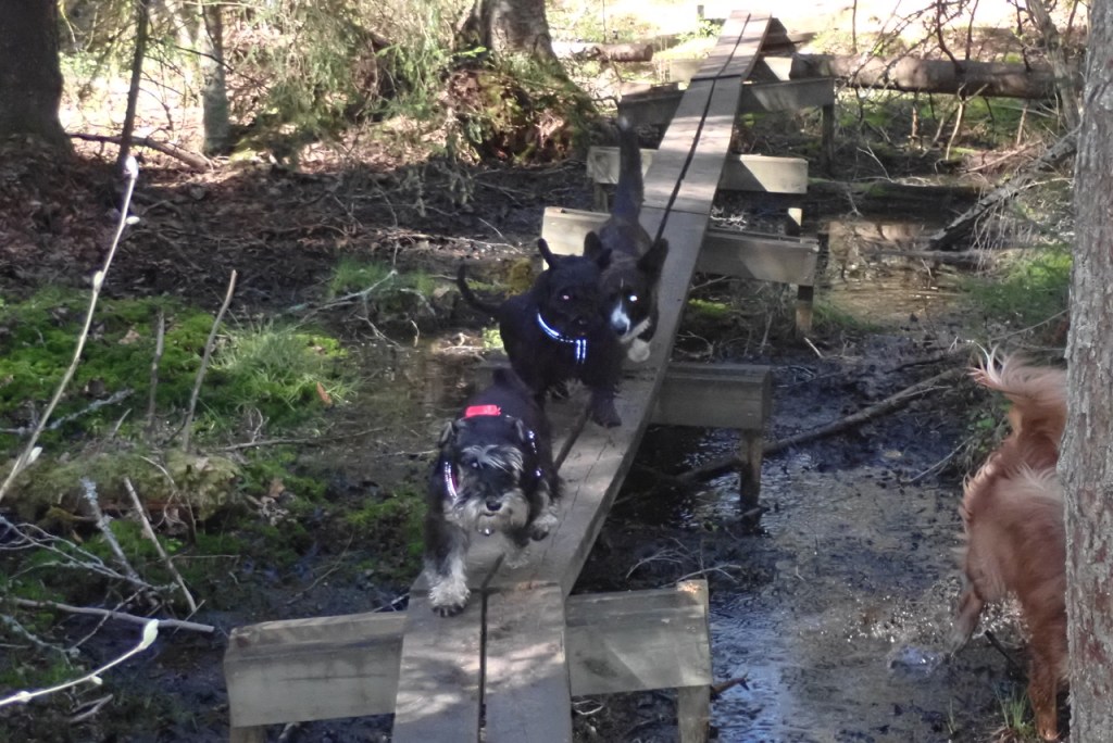Hör ni ha inte så bortom Va! Nu går jag först på spången och jag vill absolut inte ramla ned i det där sörjiga vattnet. Basse han är i han men så är han ju en badgalning också.