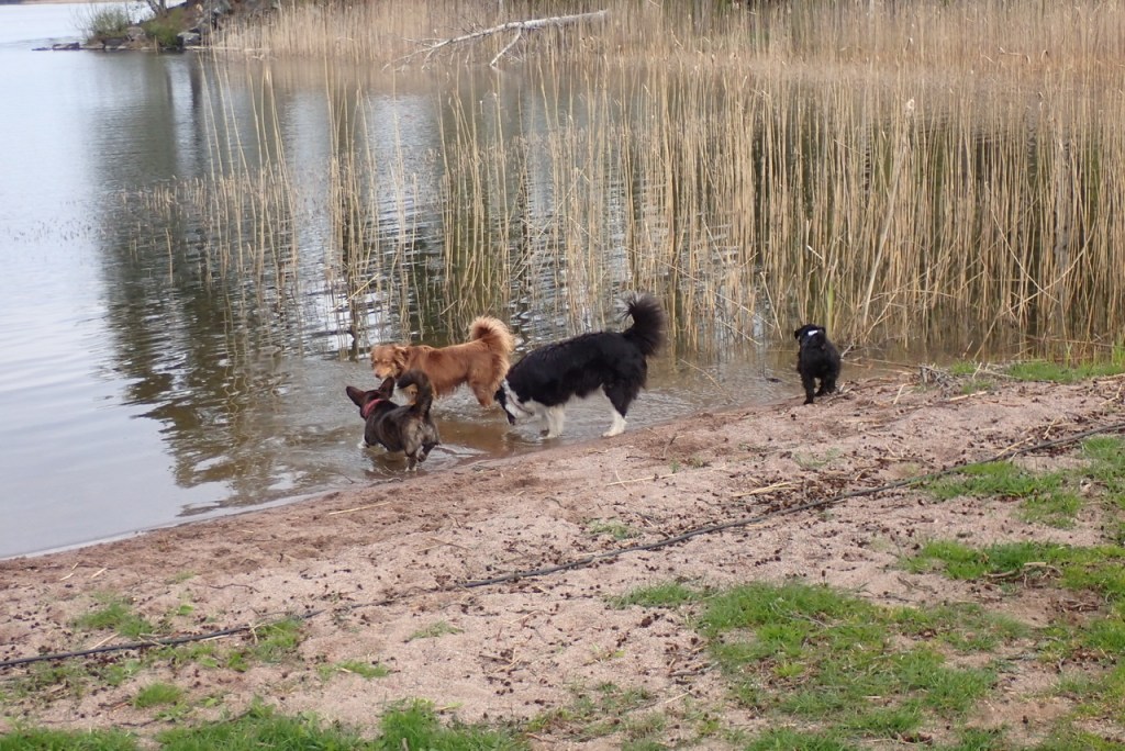 Äntligen kom Helena med våra kompisar, det är en hel evighet sen sist vi sågs. Vi gick ned till hundbadet där fick vi rasa av oss på fria tassar. Jag håller mig på avstånd från vattnet för jag vill inte bli våt och smutsig. Troy undersökte om det fanns någon gyttja i vassen.