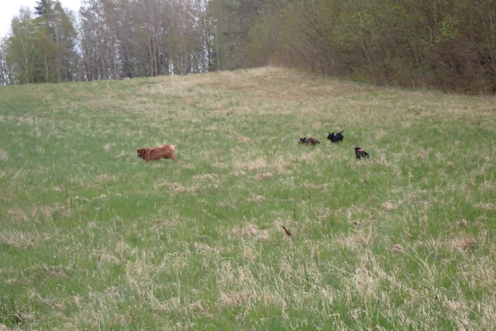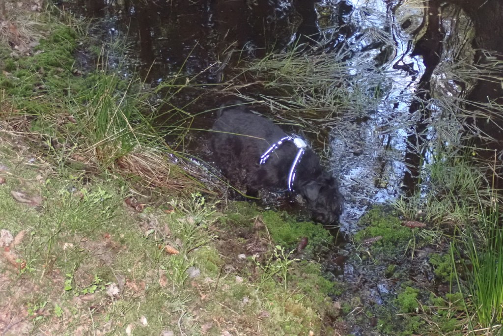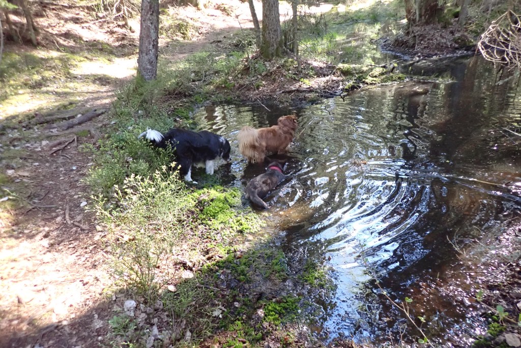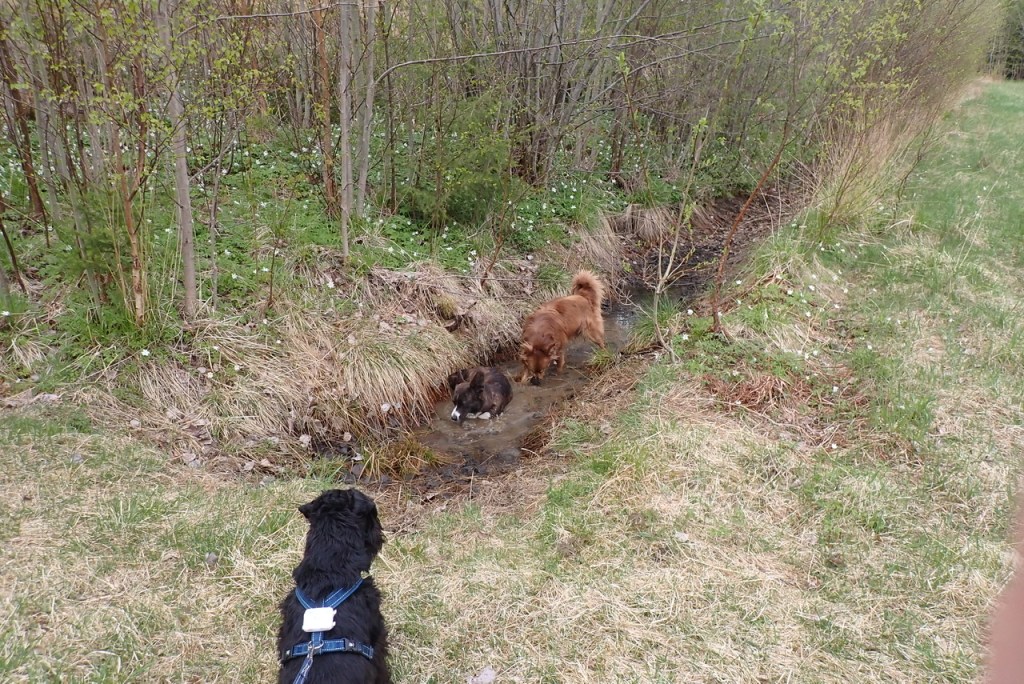 Vilken tur att matte hade kopplat Troy pga att vi närmar oss en bilväg. Jenna och Basse som fortfarande var lösa, tog saken i egna tassar och innan någon han protestera hoppade de ner i lerdiket. Där rullade de runt av hjärtats lust. Troy ylade lite av besvikelse över att inte få vara med. Jag bada? …Nähä bevara mig väl då blir man smutsig och det slutar aldrig väl, det brukar bli vattentortyr med schampo i hundduschen