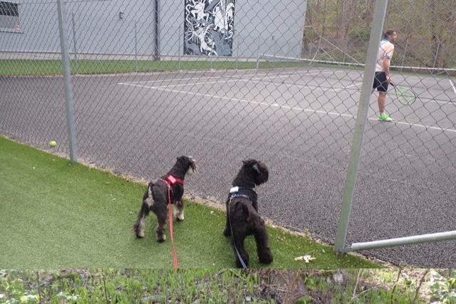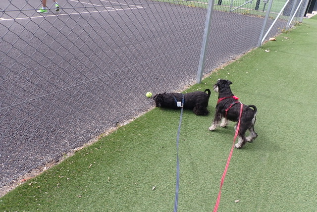 Troy var väldigt ivrig på att få gå till tennisbanorna. Förra gången vi gick förbi här snackade Troy med en kille som spelade tennis. Troy erbjöd sig att vara bollkalle, ingen bra idé då han troligen inte skulle lämna ifrån sig bollarna. Undrar hur många han kan trycka in i munnen.