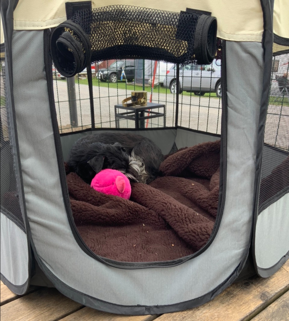 Tillbaka vid vagnen Och vi är lite trötta. Troy la sig i grodställning och vilade.