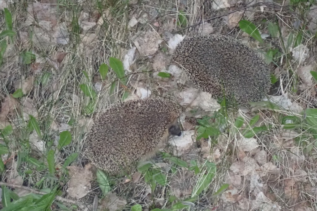 Konstiga saker vi får se på kvällspromenaden herr och fru igelkott. De brydde sig inte om oss och matte sa att vi inte fick nosa på dem. Man ska inte störa dem sa hon och de kan ha något som heter igelkottsloppor och dom bits! Vi fick inte skälla på dem heller, ibland är matte väldigt tråkig.