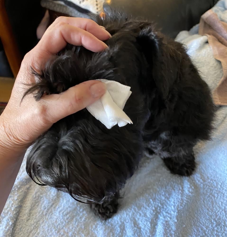 Jag sa till matte, titta här Troy har nån gegga i ögat. Jag försökte tvätta rent men matte sa att man behöver tvätta med koksaltlösning. Troy tyckte om mattes behandling och han har redan blivit bättre.
