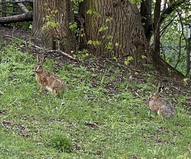 Vov, alltså dubbel vov! Hemma i parken finns många harar. De bor ner på idrottsplanens gräsytor men kommer gärna upp på våra gräsmattor för att äta lite.