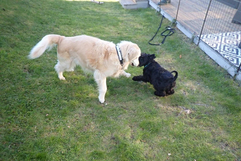 Troy är busig så där tonnårstrotsig. Han kommer inte hela vägen fram till matte när hon kallar utan bara så där retfullt nästan inom räckhåll. Matte överlistar busen med hjälp av gröna dinosaurien med pip.
