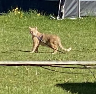 På eftermiddagen kom det en husbil till campingen och vi hade full koll på dem när de parkerade på andra sidan grusvägen. Det visade sig att det var rätt att hålla koll DE HAR EN KATTA-STROF i Lina!!!