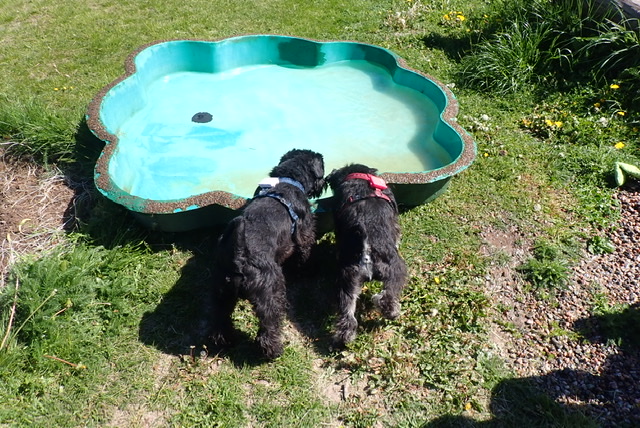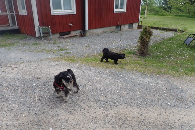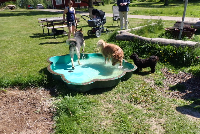 Troy var som vanligt kär i alla tikarna han har fullt sjå att kolla av alla innan han väljer ut en favorit och idag blev det Chess. Tommy och en liten kille som heter Walle grejade med den lilla hundpoolen. Den skulle göras ren efter vinterförvaring. När det var klart spolades det upp vatten i den, mycket vatten, väldigt mycket vatten får jag säga. Jag och Troy inspekterade men vi avstod dock från ett premiärdopp av tassarna. Det fanns anda badgalningar som genast hoppade i och plaskade runt t.o.m. doppade hela kroppen. Poolen är uppskattad av alla hundar särskilt nu när det är sååå varmt i solen. Men man skall inte överdriva med helkroppsbad!