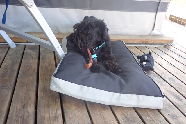 Det började regna igen och vi gick hem till vagnen igen. Helt genomvåta var vi men efter en torknings omgång med badhandduken kan man övergå till att lufttorka dvs man springer runt som en galning. Sen var matte snäll, vi fick varsitt revben. Fortsätter med att ta in godsakerna i kojan för där får jag smaska ifred.