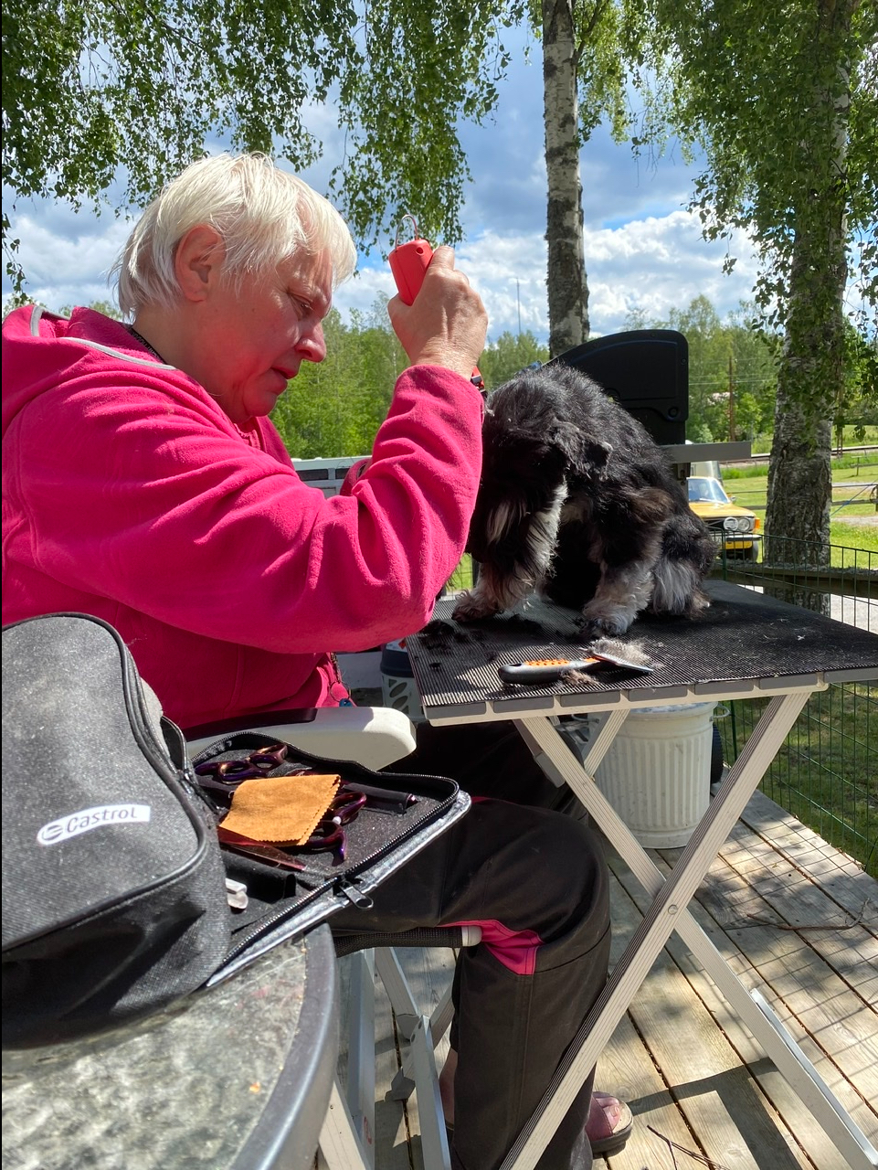 Åter vid vagnen där är väntade en mycket otrevlig överraskning, trimbord och trimgrejor kom fram och det var nu min tur! M säger att jag måste fixas lite. Måste fixas till, JAG… jag är alltid snygg så här behövs ingen fixning, så det så! Föga hjälper min åsikt! Sen efteråt när jag visat mitt missnöje genom att sura kvadrat kommer M och försöker muta mig med ett revben. Men nähä så lätt går det inte, jag tog det inte. Jag tog det som Troy fått istället. Att han sen gick och tog det jag nobbade spelar ingen roll byteshandel är helt ok enligt min uppfattning.