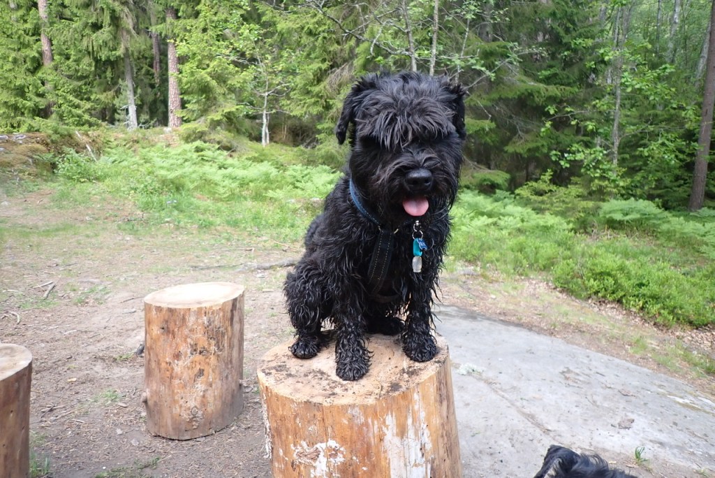 Någon har släpat hit några sittstubbar och Troy tyckte att det var ett ypperligt tillfälle att visa sig på styva linan. Han hoppade upp på en och visade att han hade bra balans för den var lite vinglig. Den avancerade cirkuskonsten kräver mycket godis sa han och satte sig ned på sittstubben. Jag ställde mig med framtassarna uppe på en annan stubbe och krävde samma tilldelning. Det slutade med en allmän godisutdening till alla.