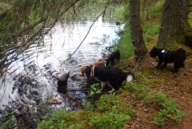 Så gick vi runt sjön och hade en liten konferens om vilket bus vi skulle göra nu! Basse tog en väldigt fin pinne och rusade runt med attityden, ni kan inte ta den! Det måste vi göra något åt omedelbums. Vi for fram över stock och sten och Wilma som den grand old lady hon är i detta gäng tog av Basse pinnen med en elegant knyck. Det var vi andra nöjda med fast inte Basse som högljutt klagade genom att skälla som en galning, fast det hade han inget för.