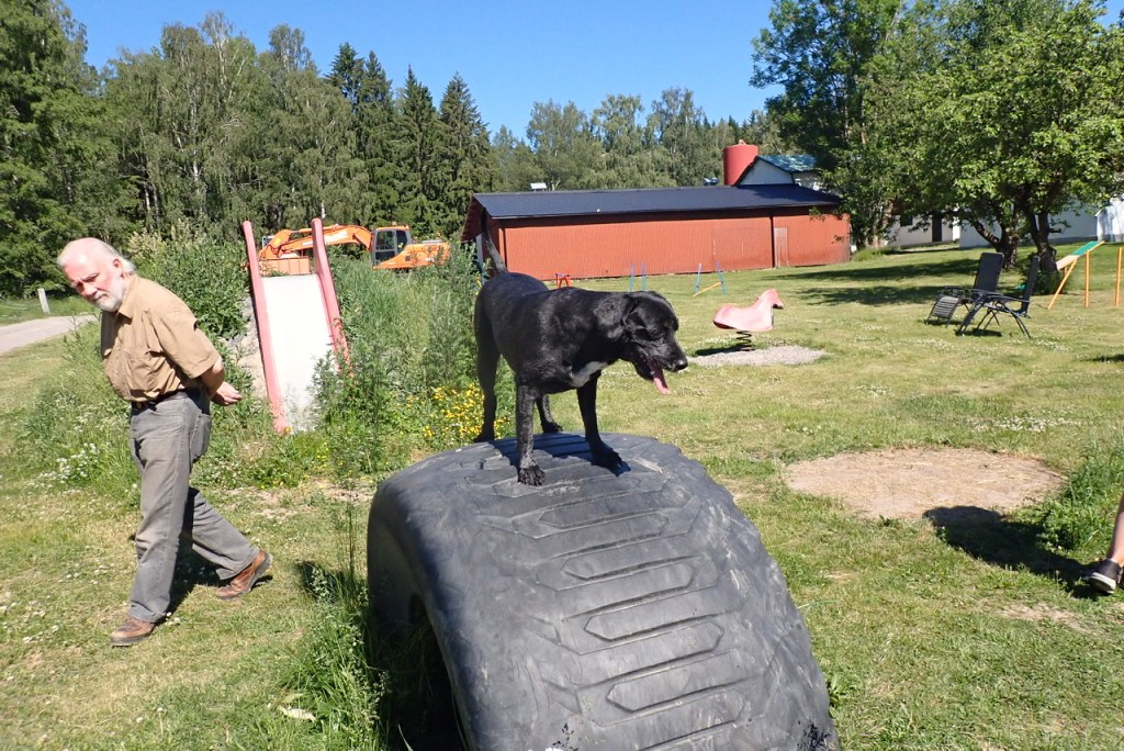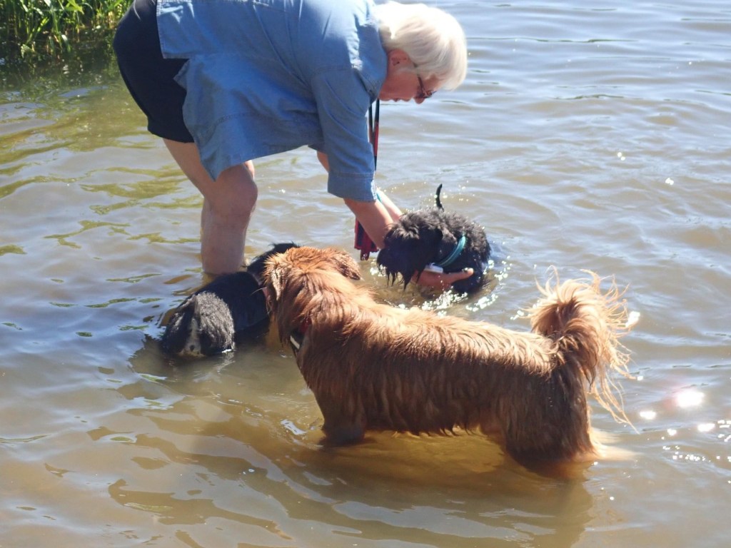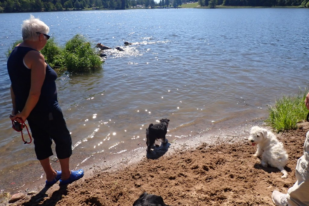 Jag gick lugnt ut till honom och visade hur man simmar. Jag simmade runt honom och plötsligt lugnade han sig och började simma som man ska. Först lite för snabba simtag sen förstod han att man kan ta det lite lugnt med simtagen. Efter min insatts som simlärararinna, ja faktiskt är jag en hjältinna, simmade vi in till land och gick upp. M stod kvar i vattnet och blev lite av ett rundningsmärke för de andra hundarna, hon blev ganska blöt! Det tyckte jag var roligt!