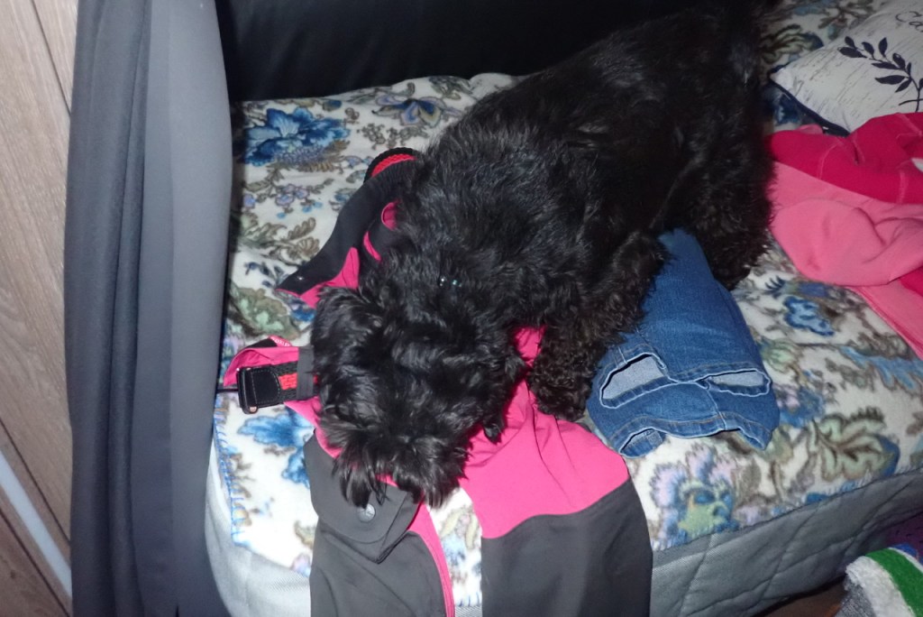 När ingen ser smyger Troy iväg upp på sängen där han undersöker mattes byxfickor. Sen sitter han där och njuter av sitt stöldgods utan att dela med sig. När matte upptäcker honom säger hon , men hörru ditt lilla fjuss! Vi har ingen självservering här! Sen tar hon byxor och det eventuella godis han inte hunnit äta upp. Sen sker nått konstig, hon busar lite med honom och sen, sen får han en nospuss trots att han gjort bus!!! Alltså nu fattar jag nada, jag skulle aldrig göra så, säger jag med tassarna i kors 😉.