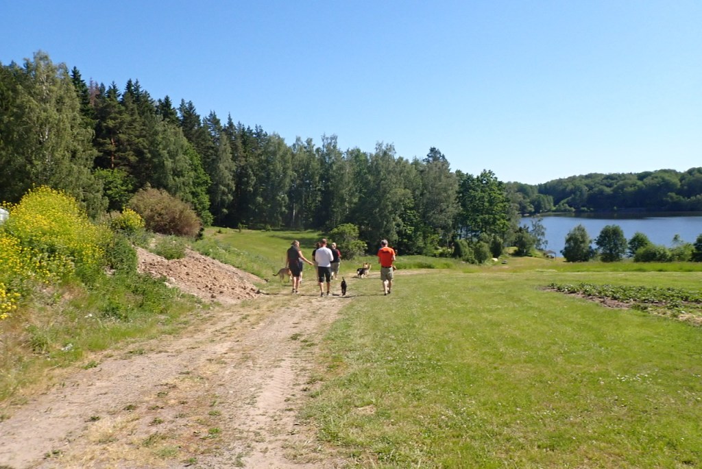Bassehusse, Tommy, tyckte att vi skulle gå ned till stranden och bada. Men när vi skulle gå förbi odlingarna måste vi vara kopplade. Tvåbeningarna gillar inte att vi kutar runt bland grödorna, de e lite kinkiga tycker jag. Så fort vi var förbi var det fria tassar igen. Då var det bråttom ned till badet.