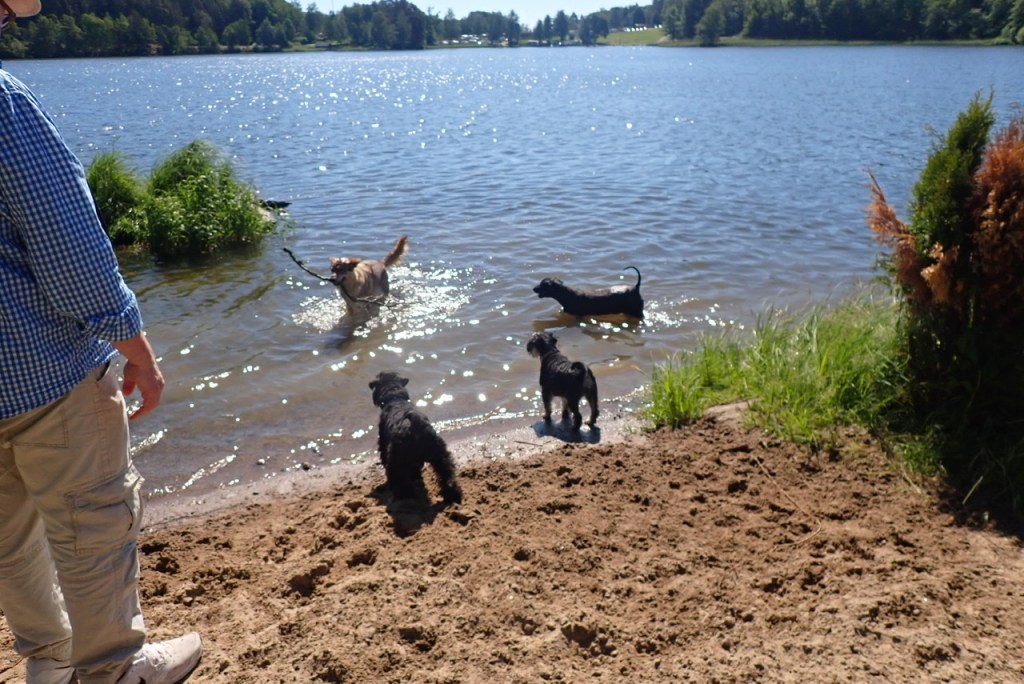 När vi kom ned till stranden rusade alla badglada kompisar ut i vattnet. De badade av hjärtats lust vissa simmade runt den lilla ön. Vi stod kvar vid strandkanten och lilla Charlie var väldigt tveksam till vatten.
