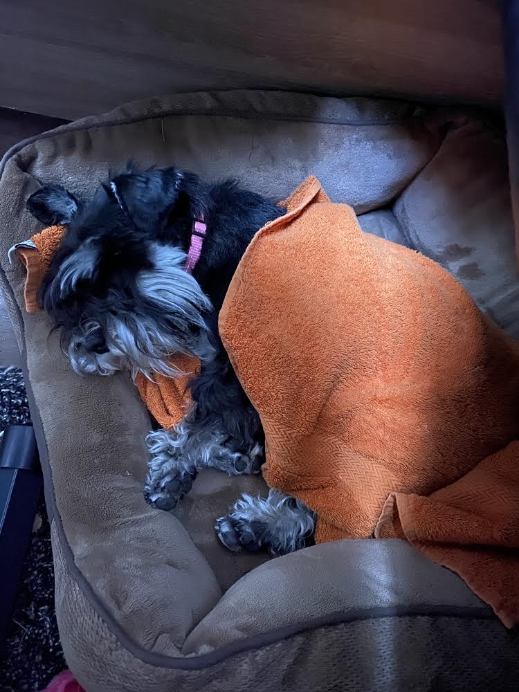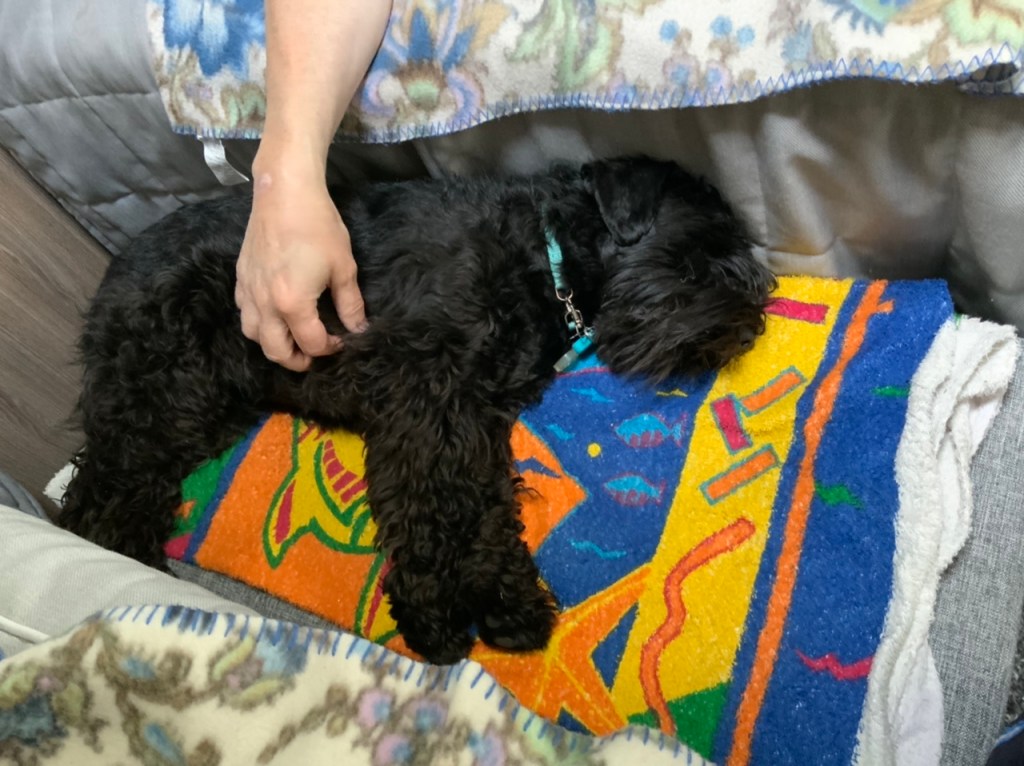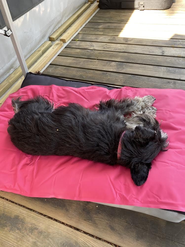 Efter en dag på hundträffen och en del tid på trallen kollandes de som kommer och de som åker blir man trött. Husvagnar och husbilar far åt alla håll. Då är en liten eftermiddags lur är skönt, Troy sover tryggt bredvid husse som kliar honom lite gosigt. Själv lägger jag mig i min koja under bordet och när M lägger på mig en handduk som filt duckar jag in fullständigt.