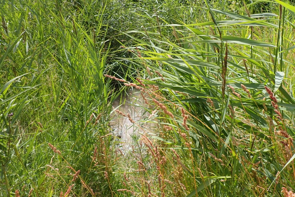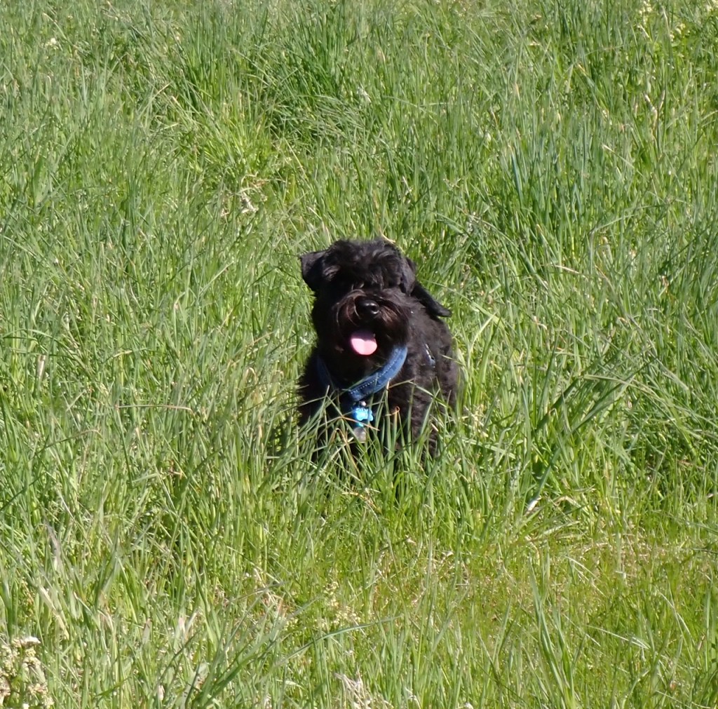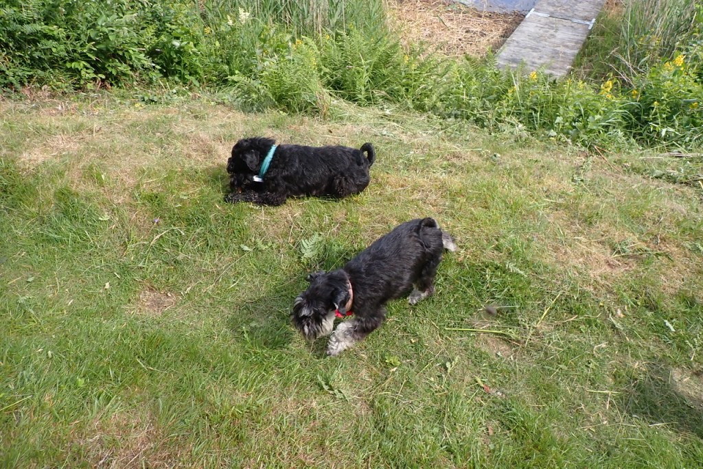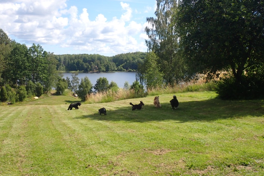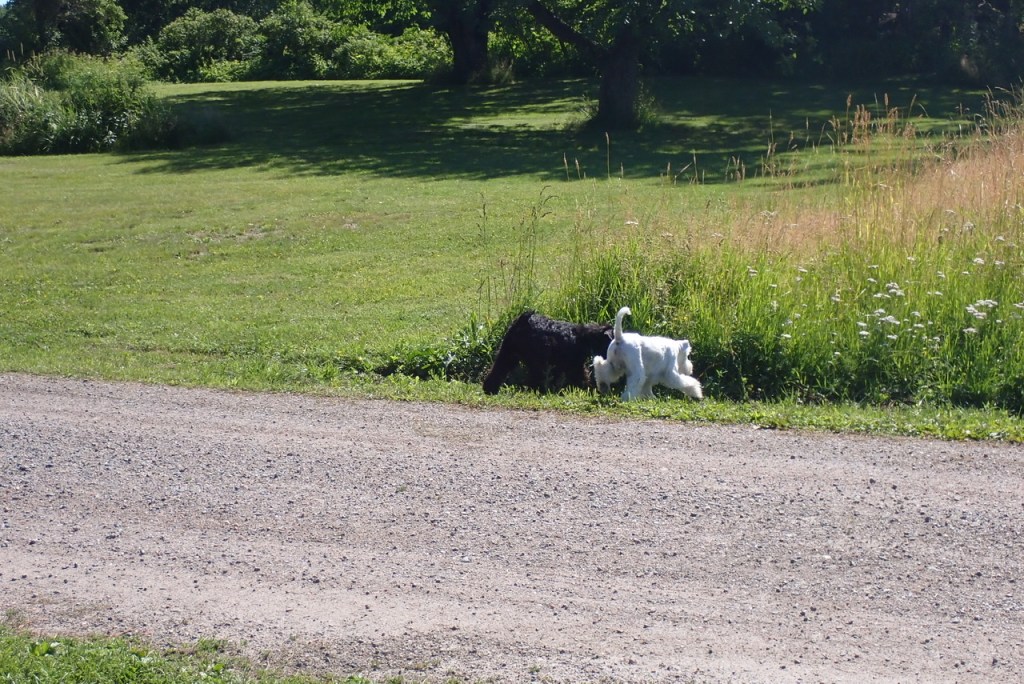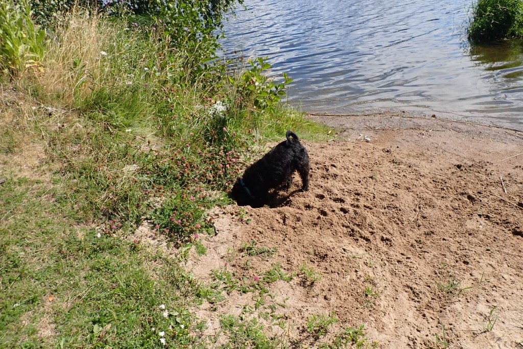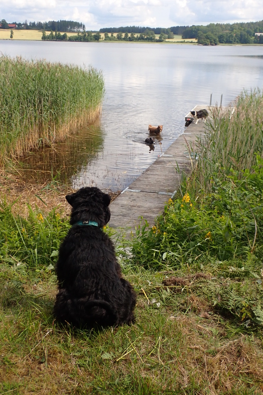 Efter träffen gick vi till odlingen för att kolla på grödorna. Potatisen kommer väl men av rädisorna syns inte ett spår. Matte och Helena pratade en massa människotråk så nu när vi var lilla flocken roade vi oss lite för oss själva. Det blir ett fasligt gnällande om vi skulle råka kuta runt lite på odlingslotterna så vi tog ängen ned mot sjön i besittning istället. Basse var ner i lerdiket en sväng och svalkade av sig. Han besöker regelbundet sitt alldeles egna hundspa han säger att lerinpackning av pälsen är mycket bra.