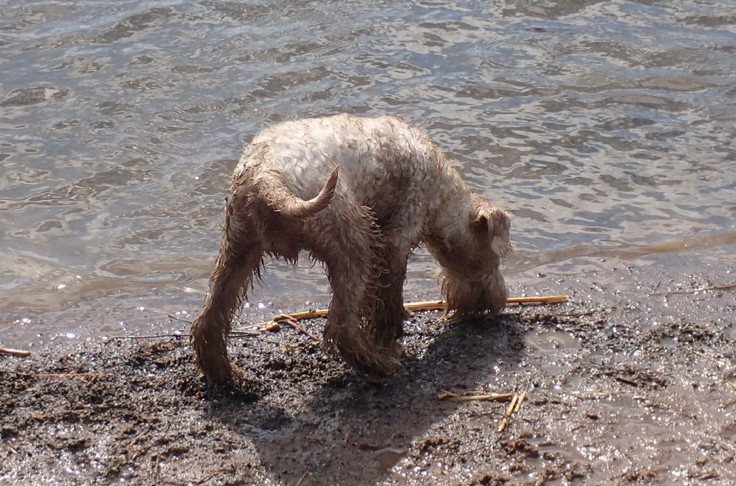 Lilla Charlie som egentligen är en vit schnauzer hade väldigt roligt på badstranden. Hans huse sa att plötsligt har jag en sandbrun schnauzer. Matte som alltid ska hålla på och hälla vatten på oss titt som tätt tipsade Charlies husse om att spola av honom med slangen uppe på hundlekplatsen. Vi tycker att det var totalt onödigt. Det finns ett ordspråk som lyder så här: En lekande hund som är smutsig är en lycklig hund.