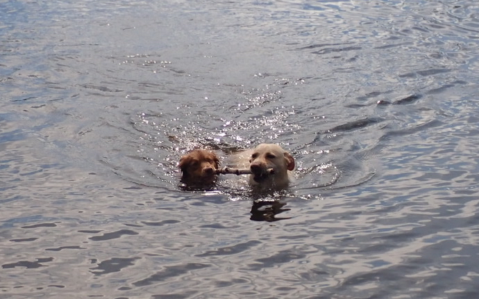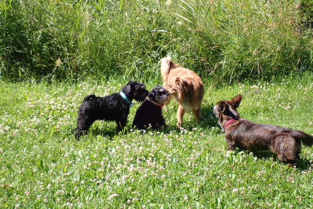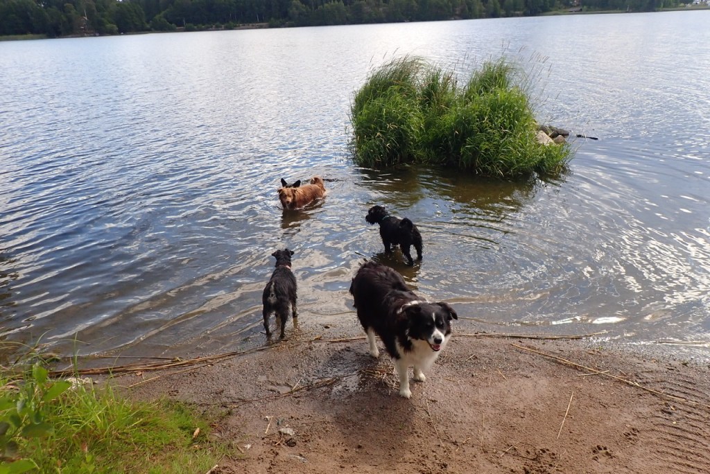 På lördagens hundträff var det bad som gällde. Basse och Alice övade parsim eftersom de båda ville ha pinnen.