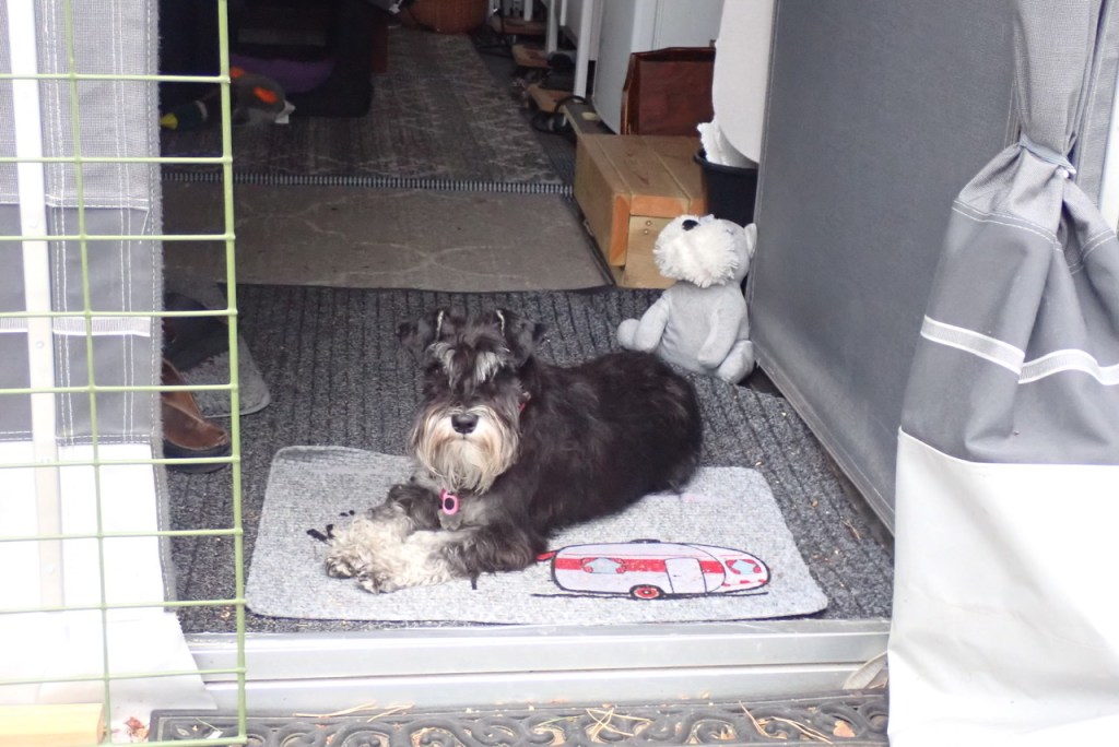 Lite tråkigt väder det småregnar med jämna mellanrum. Jag har gått i ide och väntar på att det skall klarna upp men Troy måste hålla koll på campingen och ligger vid tältdörren. Han har med sig en back upp i form av ”snuzze the dörrstopper”. Blir det allvar av får jag också stöta till.